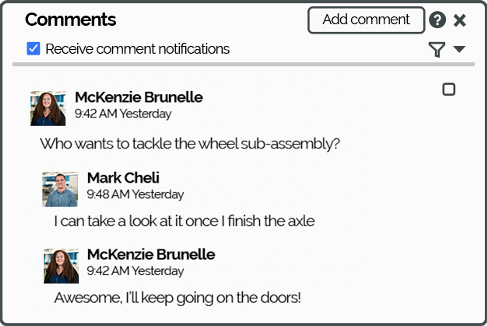Work together in the same version, in the same Onshape Document. There is no need to check out files or worry about version conflicts. Students and teachers can work together in real time, making it easy to collaborate. With features such as Commenting, Tagging, and Branching, communication is streamlined and projects run smoothly.
