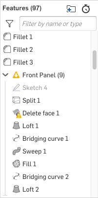 In addition to the filter at the top of the Feature list, you can now select a Part, Surface or Curve from the Parts list and the features used to construct them are highlighted in the Feature list.