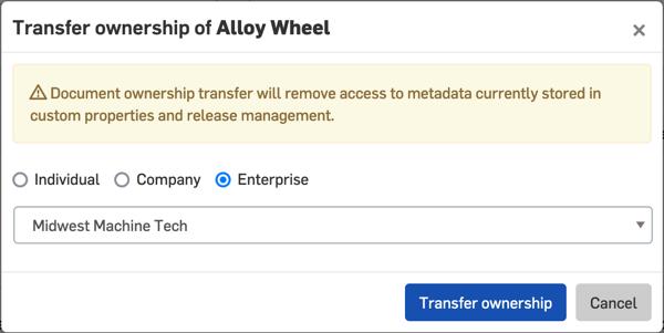 The Transfer Ownership dialog now lists Onshape Enterprise and Onshape Professional companies separately. This makes it easier for users who are members of multiple companies to ensure that the right documents are transferred to the right company.