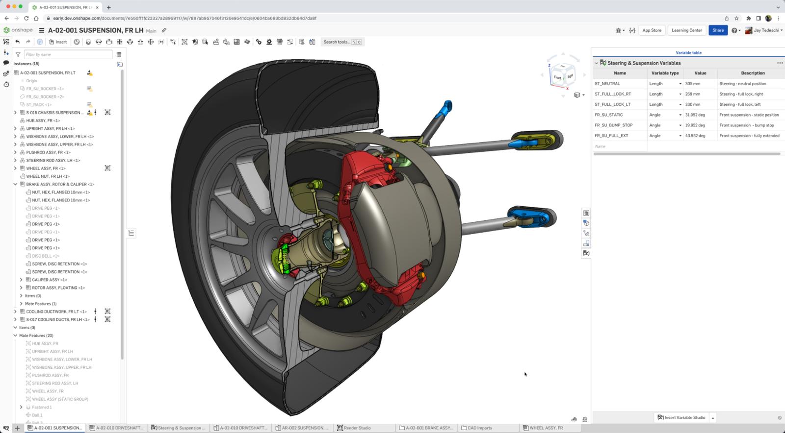 Variable Studios (Global Variables): One of the most consistently requested features over the last several years has been global variables, specifically variables that can be shared between Part Studios. Variable Studio is the tool that enables users to create global variables, expanding on the already powerful Part Studio Variables. Addressing another highly requested feature, these variables can be used in both Part Studios and Assemblies, as well as being able to be used across Documents and versioned. In the example shown below, there are variables saved that are calculated fields for the extent of the suspension travel and overall steering range of motion. Those variables are shared between the Documents used to design the suspension components themselves, the cooling ducts for the brake caliper and rotor which must clear the suspension components, etc.