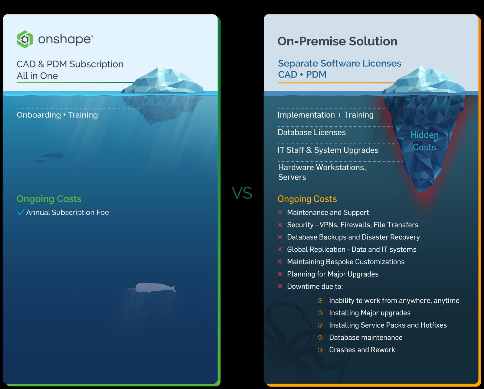 The Iceberg Effect: The hidden costs of on-premise product development solutions vs. an Onshape subscription.