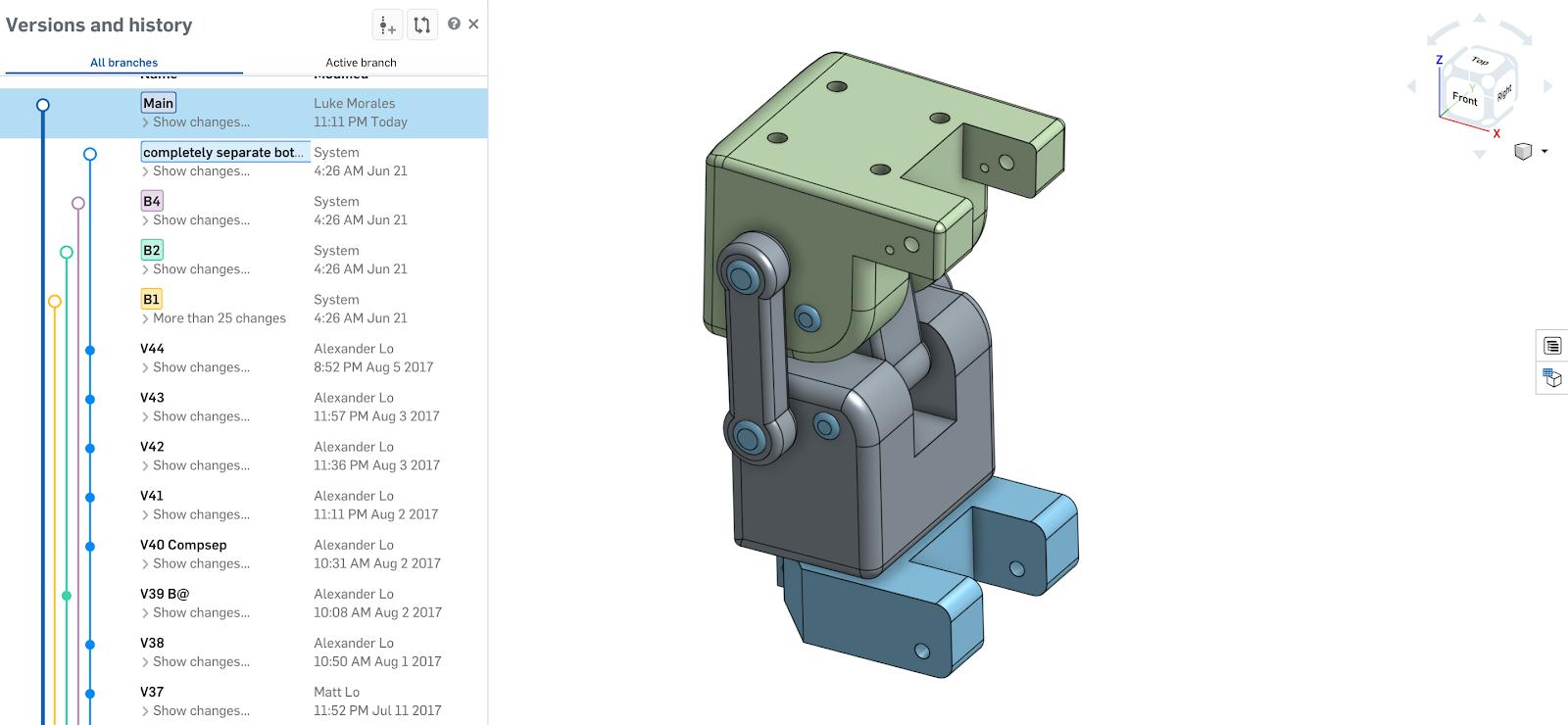While all of the initial founding members of Koi Prosthetics have graduated from Brown, many (including myself) are still actively working on the designs. Onshape has proven to be invaluable for keeping our dispersed team on the same page whenever there are design improvements or new challenges. Anyone can look at the edit history and see who did what and when — or even revert to an earlier version of the design and start a new branch to explore alternative ideas.