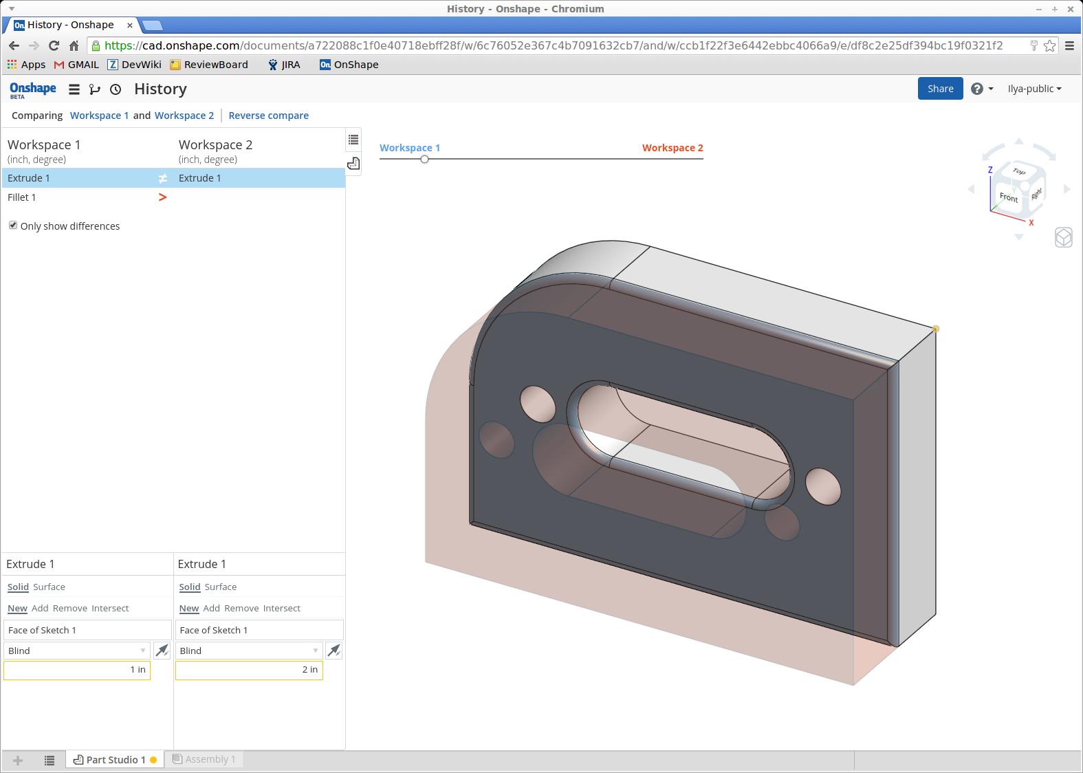 Onshape’s Compare tool lets you explore the differences between workspaces or versions of a document. Here, we are looking at the differences between Workspace 1 and Workspace 2.