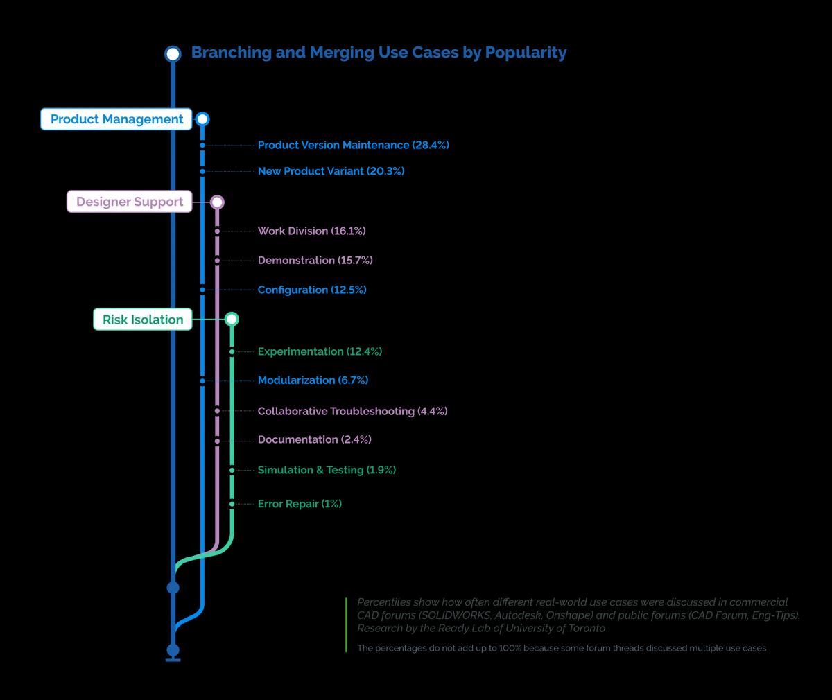 20.3% of CAD forum posts discussed branching off of existing designs – saving time and capitalizing on the quality of an existing manufactured product – to create a new version of a product for release. In this use case, there is no need to merge back the design modifications because the intended goal is to create a new product.