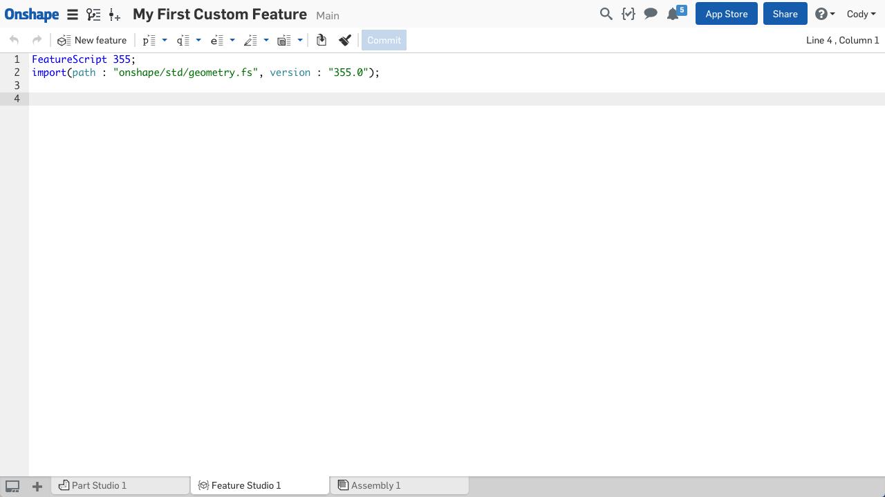 Your FeatureScript code resides in a tab in your Onshape Document called a “Feature Studio.” This is FeatureScript’s integrated development environment and it means you can write code inside your Document and use the same share and version control tools to manage revisions and collaborate