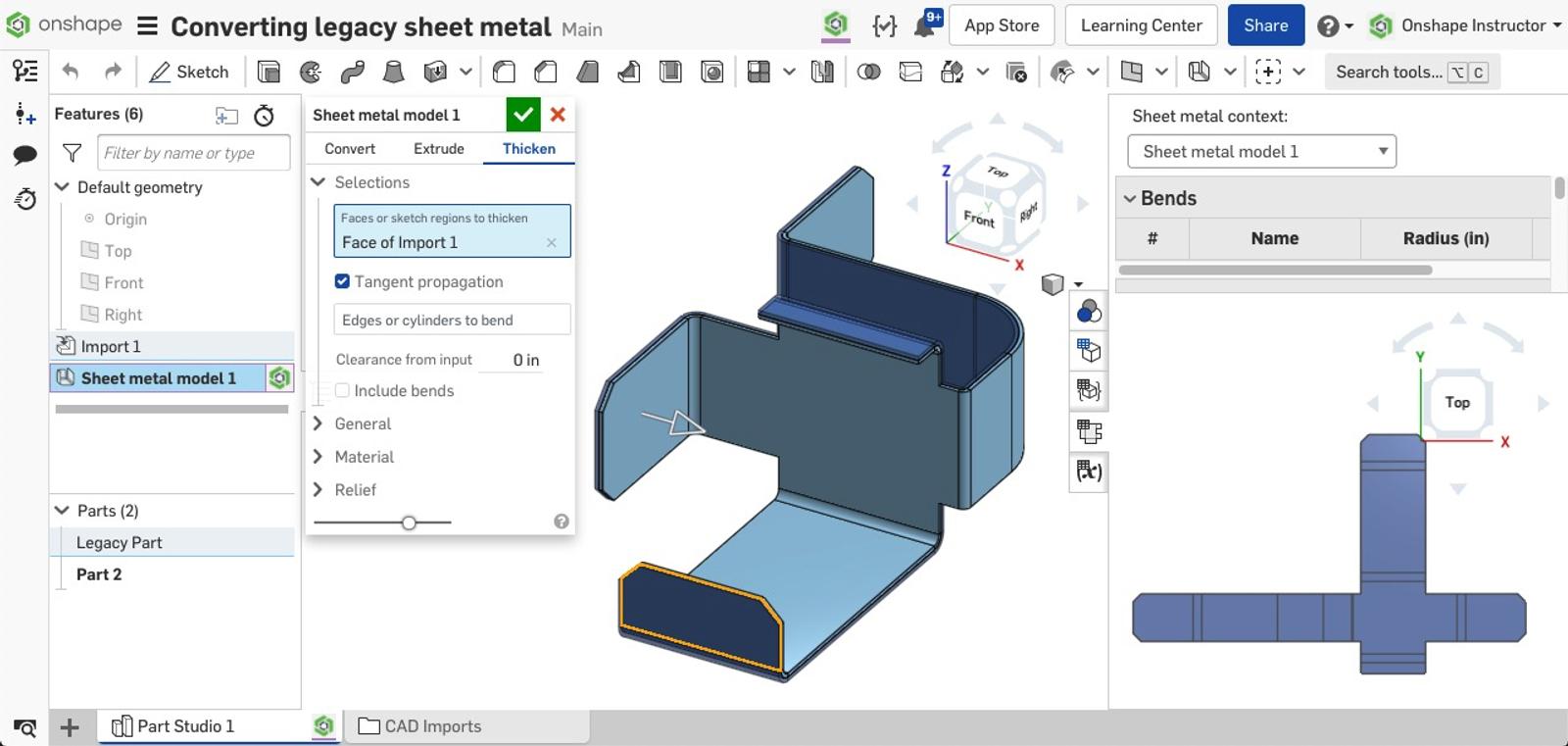 Using the Thicken workflow, legacy sheet metal parts can be imported and converted to workable Sheet Metal models in Onshape. Once imported and converted, the part will act like a Sheet Metal part created from scratch in Onshape.