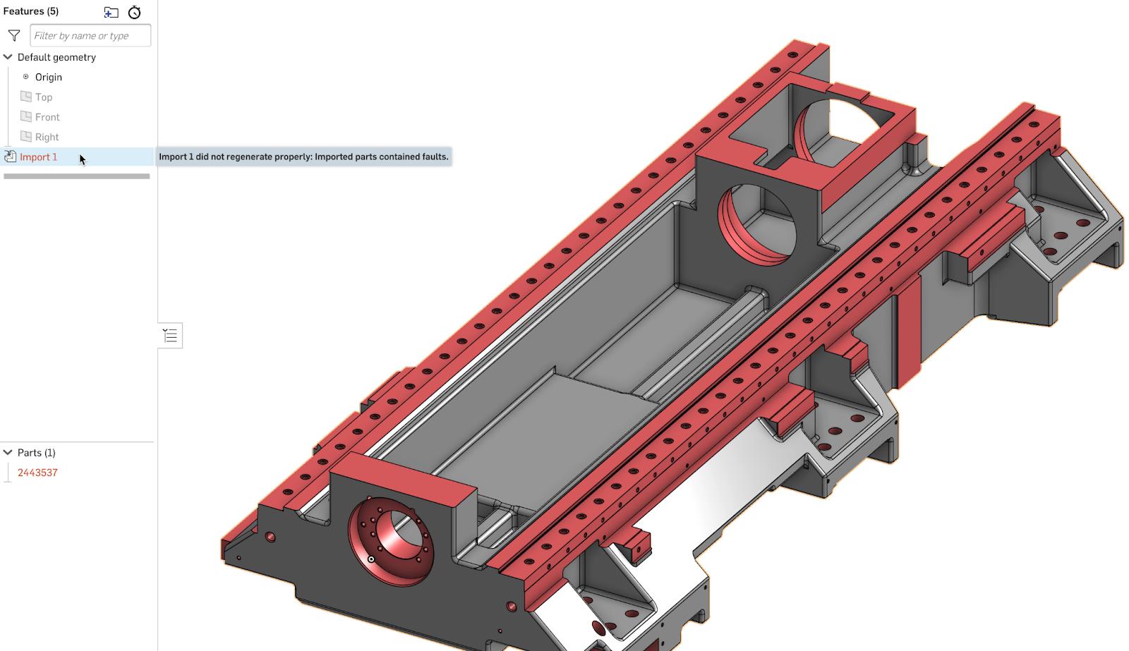 Imported geometry from other CAD packages, especially ones built on a different kernel than Onshape, sometimes imports with errors denoted by both the Import feature and the part in the Parts list showing in red.