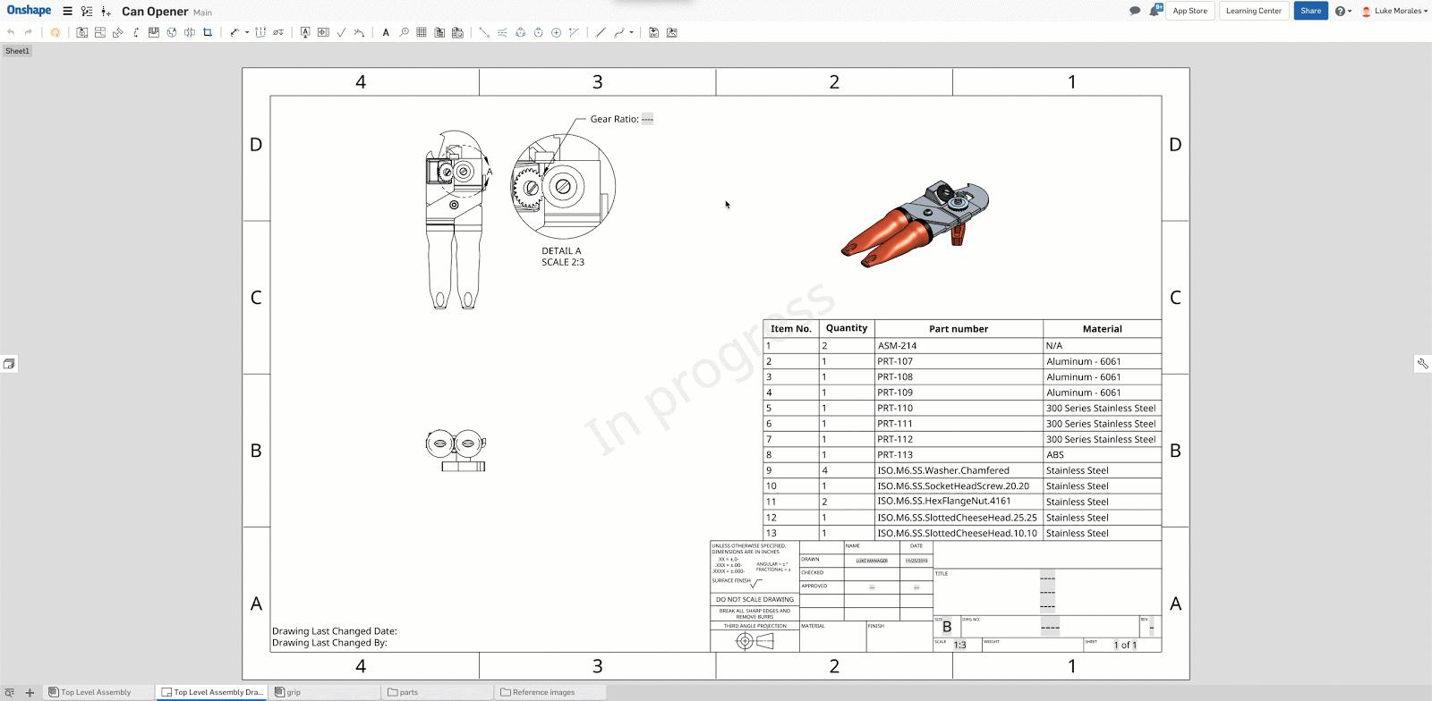 In the preset drawing template that Onshape provides, some drawing and reference properties are already linked. In this example, the drawing number automatically appeared in the title block. If you want to create your own custom template, you can find a detailed walkthrough of the best practices here.