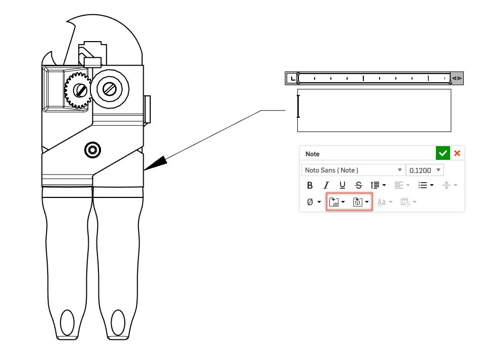 To start creating a note in a drawing, select the icon in the toolbar. You can either create a freestanding note or anchor it to a reference by hovering in the graphics space until a red triangle appears (the latter will create a note with a leader attached to the chosen reference).