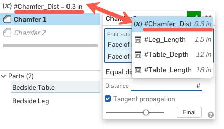 3. Many dialogues in Onshape can take in formulas. In these dialogues, any variable can be used in a formula. This is useful when you want your design to have self relationships or even spatial relationships. For example, in this Bedside Table Part Studio, I can set ‘Chamfer 2’ to the equation