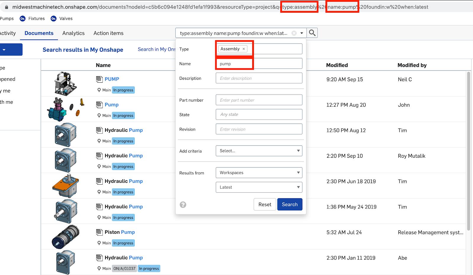 When you do a search in Onshape, the criteria for the search is put into the address string. For example, the image below is searching for assemblies with “pump” in the name. The type and name are explicitly called out in the address bar once the search is complete.