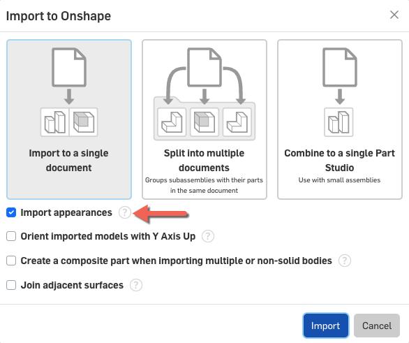 You will find a new option when importing to "Import appearances." It is on by default (meaning appearances are imported by default) but can be unchecked if you do not want the imported model's appearances.