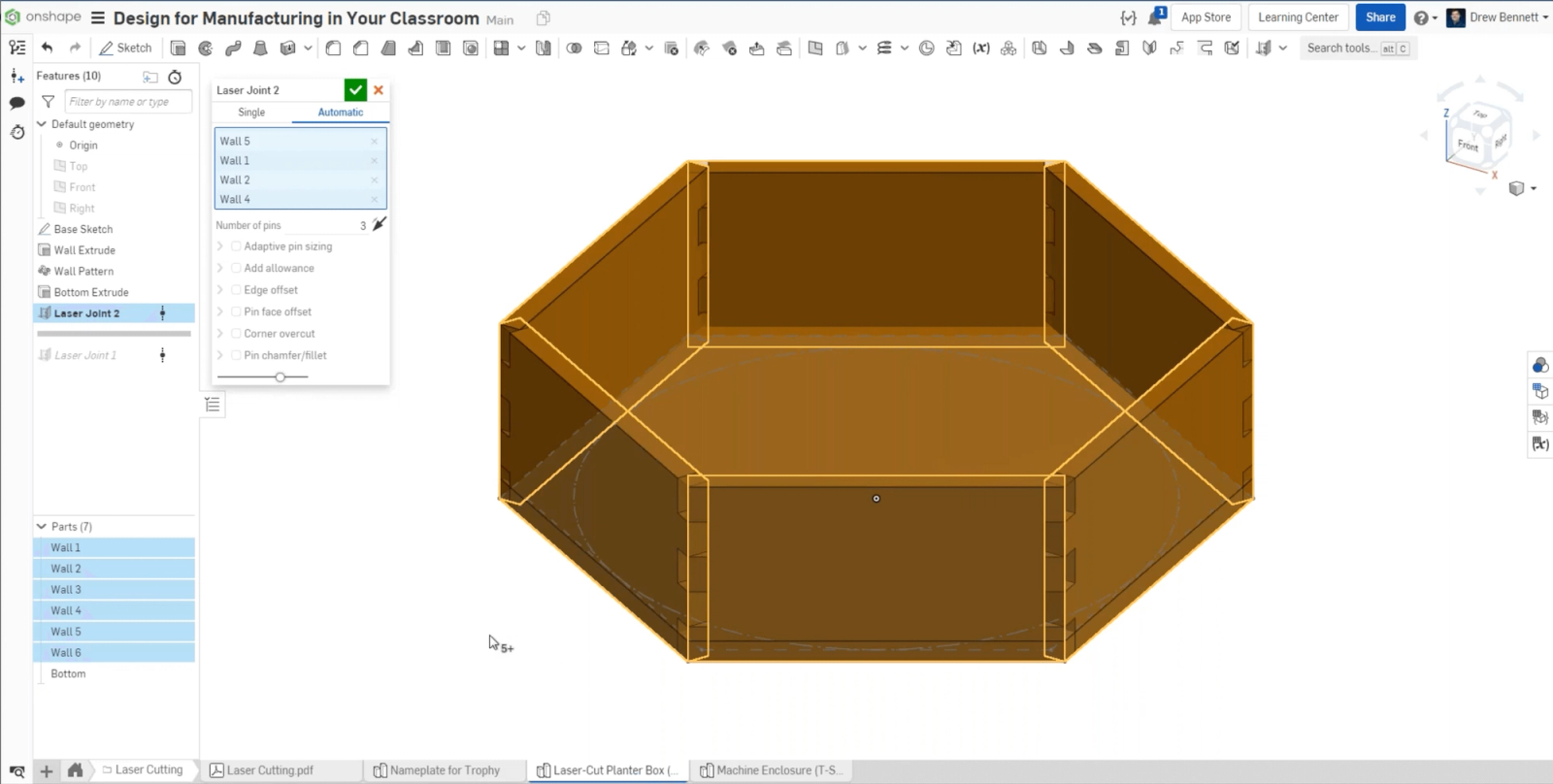 The Laser Joint FeatureScript can be used to decrease time spent sketching laser-cut finger joints as a way to interlock sides of a design.