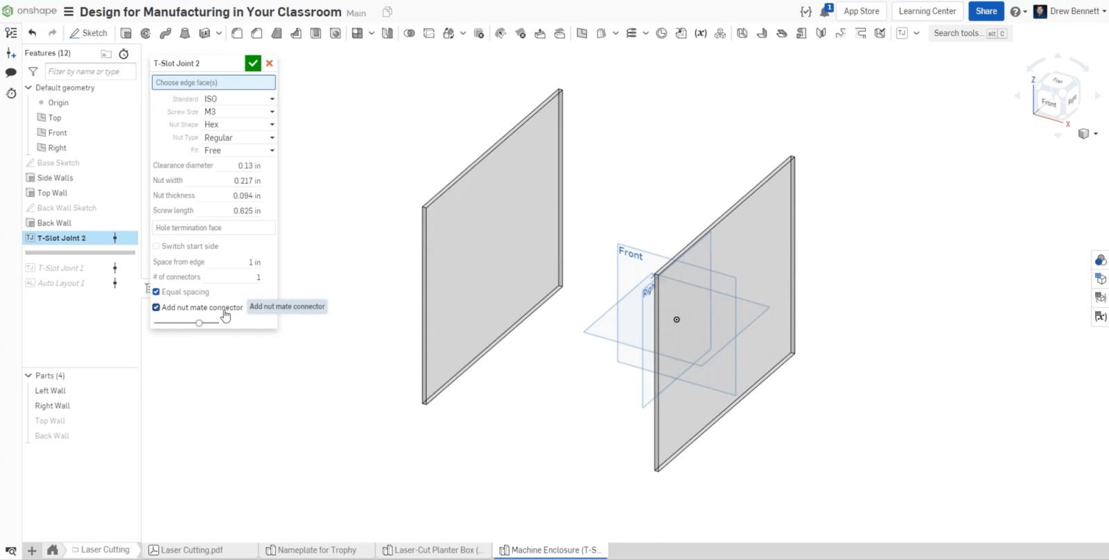 Use the T-slot Joint FeatureScript to create a space for a bolt and nut to join parts together when using a laser cutter to manufacture a design.