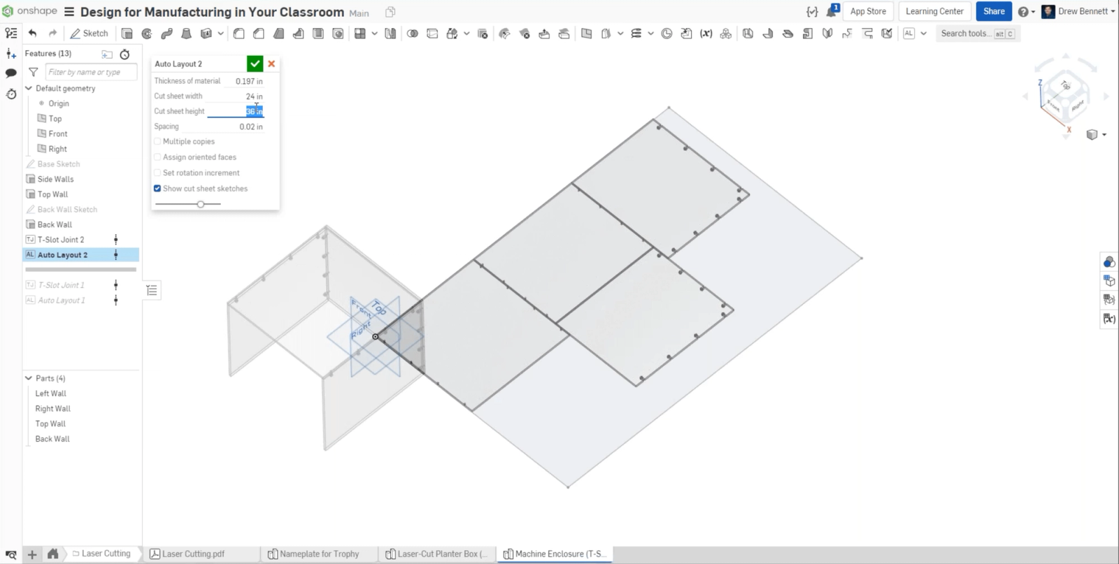 Use the Auto Layout Toolto prepare the model for manufacturing. The tool lays out each part with the same material depth for easy manufacturing, and ensures material is not wasted.