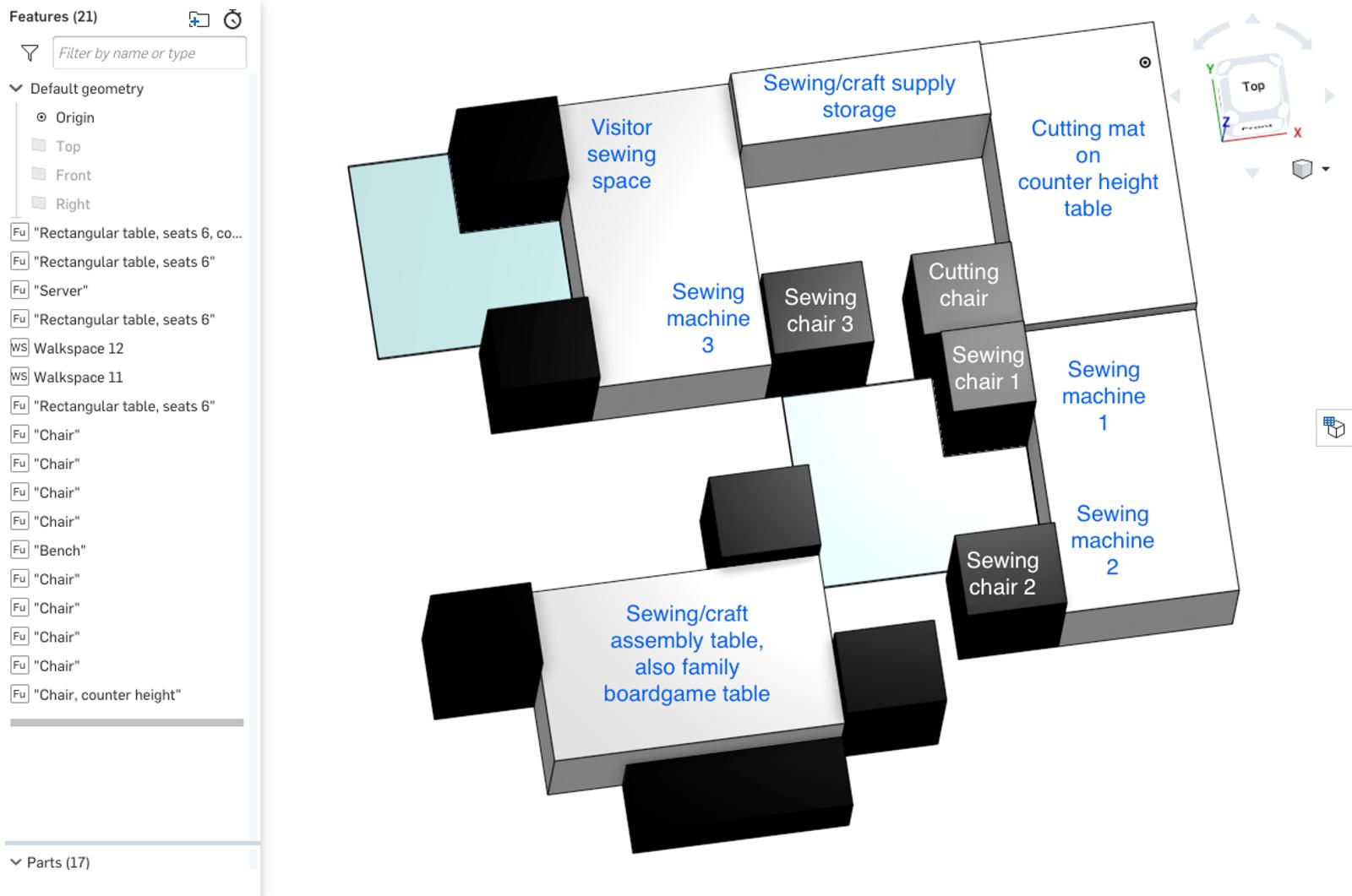 So I went back to the drawing board and created a whole new set of features to enable a “furniture and walk space first” design approach (versus a “building-first” design approach). Rather than starting with a building and rooms, I started by modeling the furniture and walk spaces around them, using “Furniture” features and “Walk Space” features (notice the “walk spaces” below in translucent blue). This gave me the opportunity to be intentional about designing the workflow of a space. Of all the spaces in my floor plan, the most challenging were the ones with more requirements and constraints. Let’s take a look at some of those challenges...