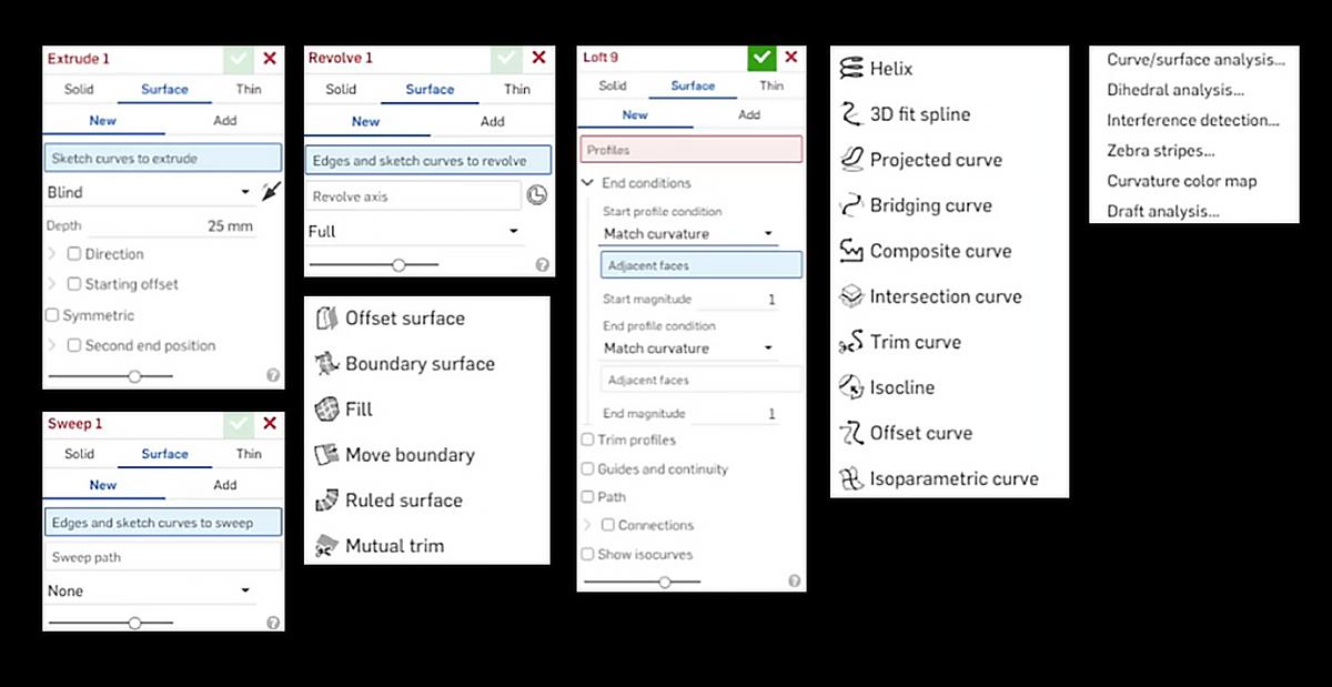 Beyond these foundational tools, Onshape’s surface modeling capabilities are organized into four main categories: