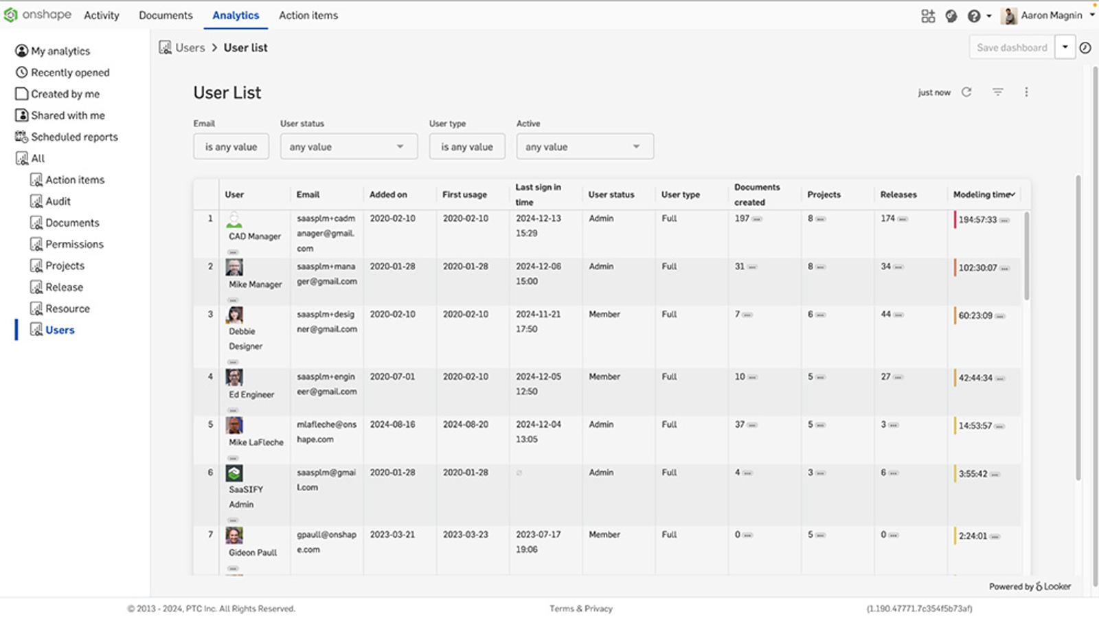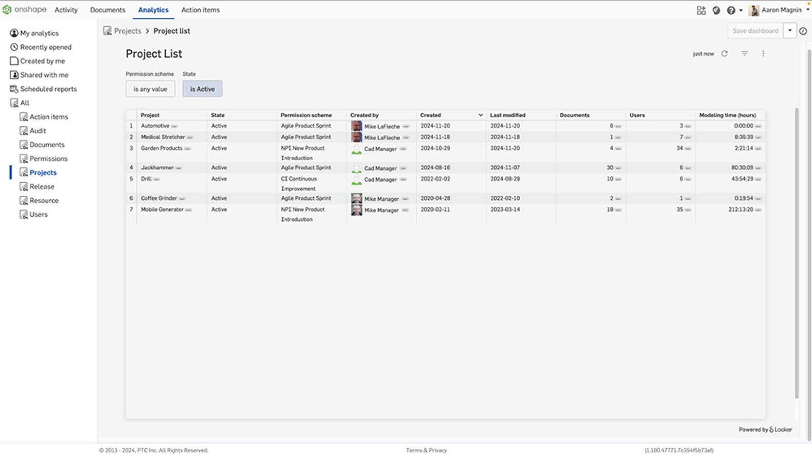 Onshape Enterprise verfolgt und visualisiert alle Designaktivitäten, Benutzerzugriffe und Interaktionen, um das Projektmanagement und die Ressourcenplanung zu verbessern.