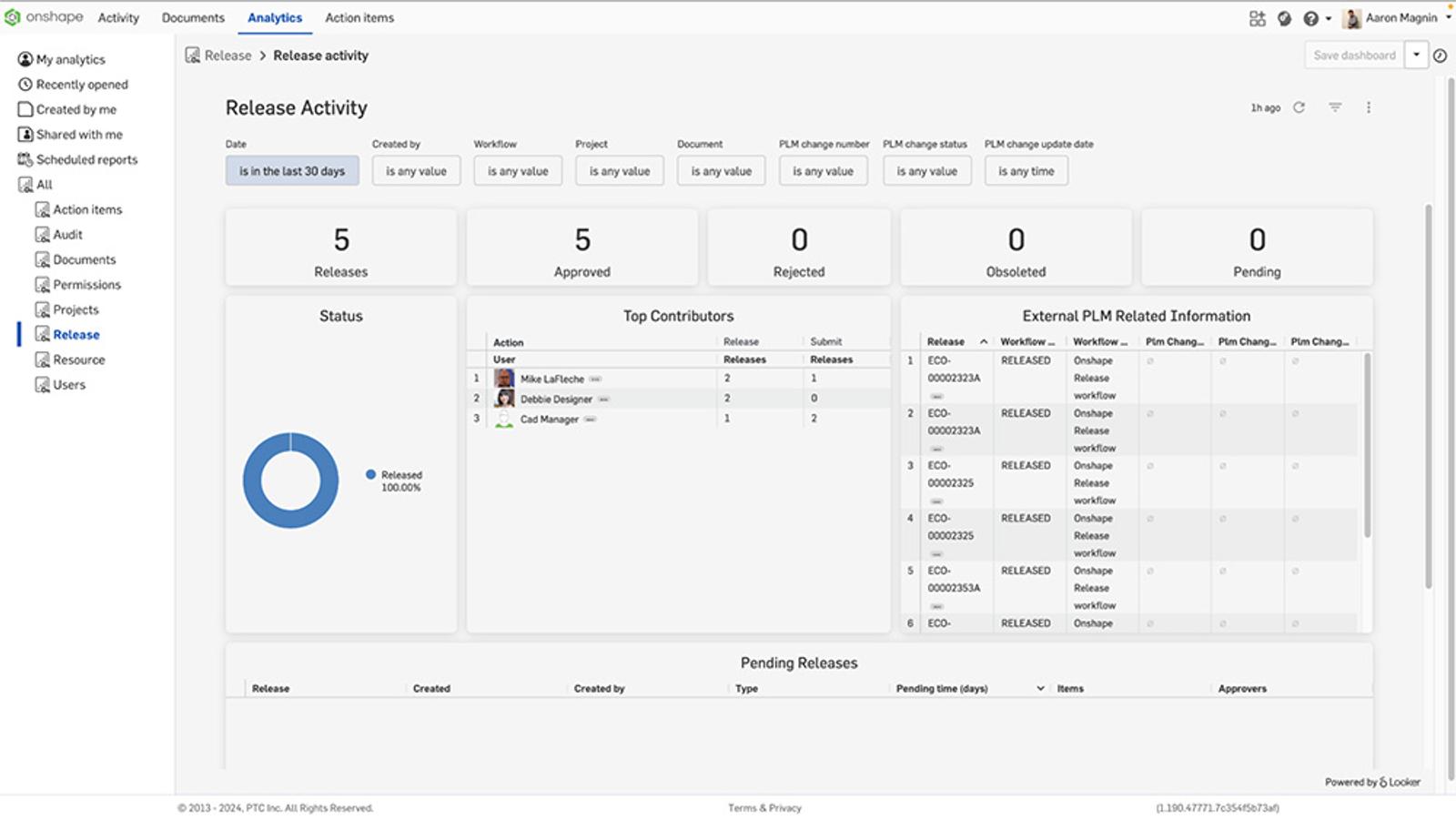 The Release Dashboard tracks all submitted Parts, Assemblies, Drawings, and data awaiting approval. View details like project ownership, submitters, approval status, and pending durations. Identify bottlenecks and streamline your approval process for better resource management.