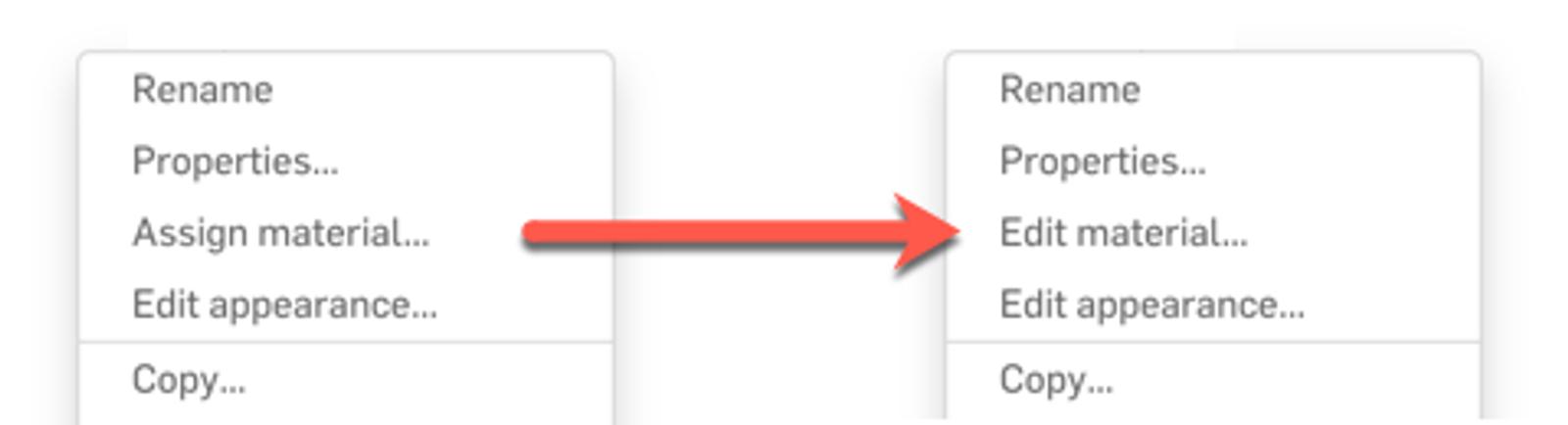 If a material has already been assigned to a Part, the context menu now changes from Assign Material to Edit Material to make it easier to determine whether a material has been assigned or not.