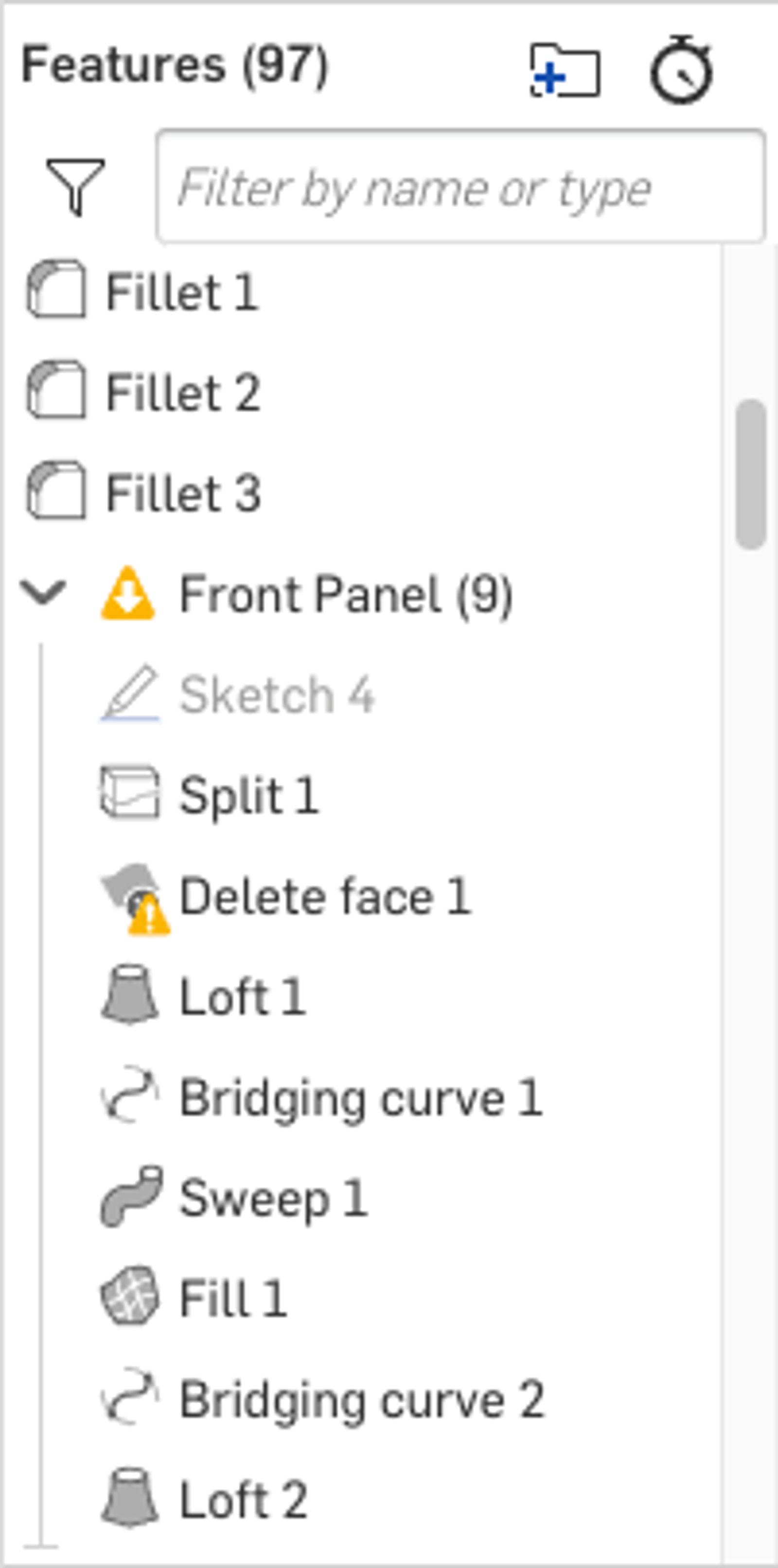 In addition to the filter at the top of the Feature list, you can now select a Part, Surface or Curve from the Parts list and the features used to construct them are highlighted in the Feature list.
