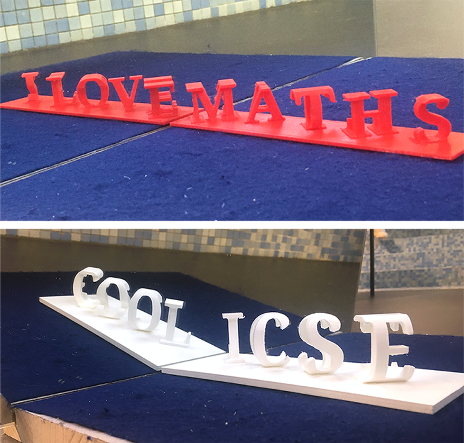 Her workshops include projects on creating magic angle sculptures, which are 3D-printed objects that with the correct lighting angle create a shadow illusion of something entirely different. She also leads a project to create dual-letter illusions, another 3D-printed object that spells out a different word in the reflection of a mirror, as shown below.