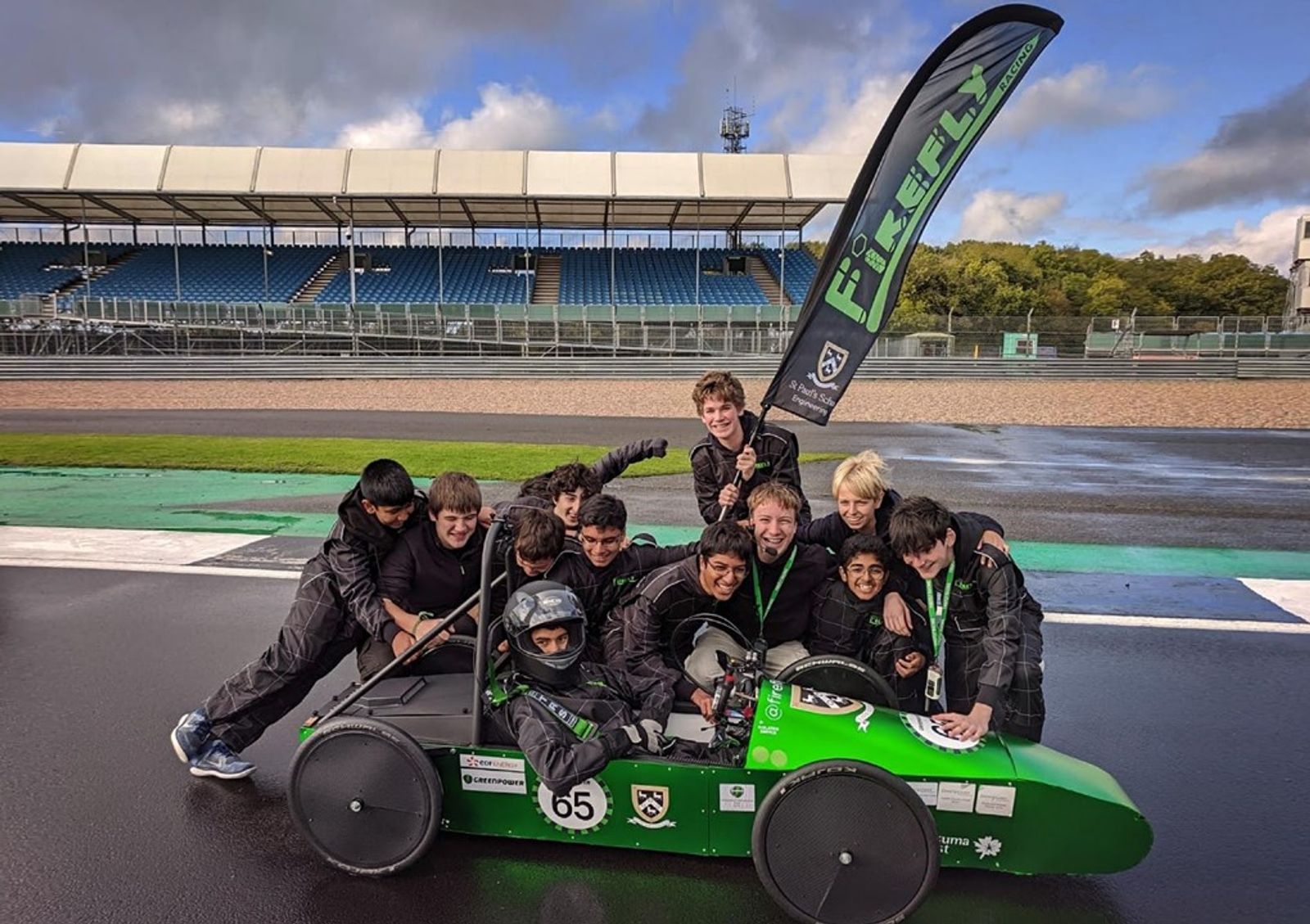 The high school motorsports circuit in England is geared toward adrenaline junkies as much as future engineers. Students wear helmets and full racing uniforms and their cars can travel up to 70 kilometers per hour (43 mph). In the International Greenpower Motor Racing Competition, teams are challenged to build cars using the same electric motor and batteries. The objective of the race is to travel the furthest distance in 90 minutes – a contest of efficiency over speed.