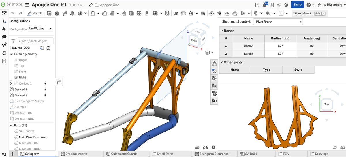 Our DuoFrame concept involves two very different manufacturing methods: machining and weldments. Onshape’s integrated sheet metal capability allows us to design all aspects in a single Part Studio, streamlining our process significantly.