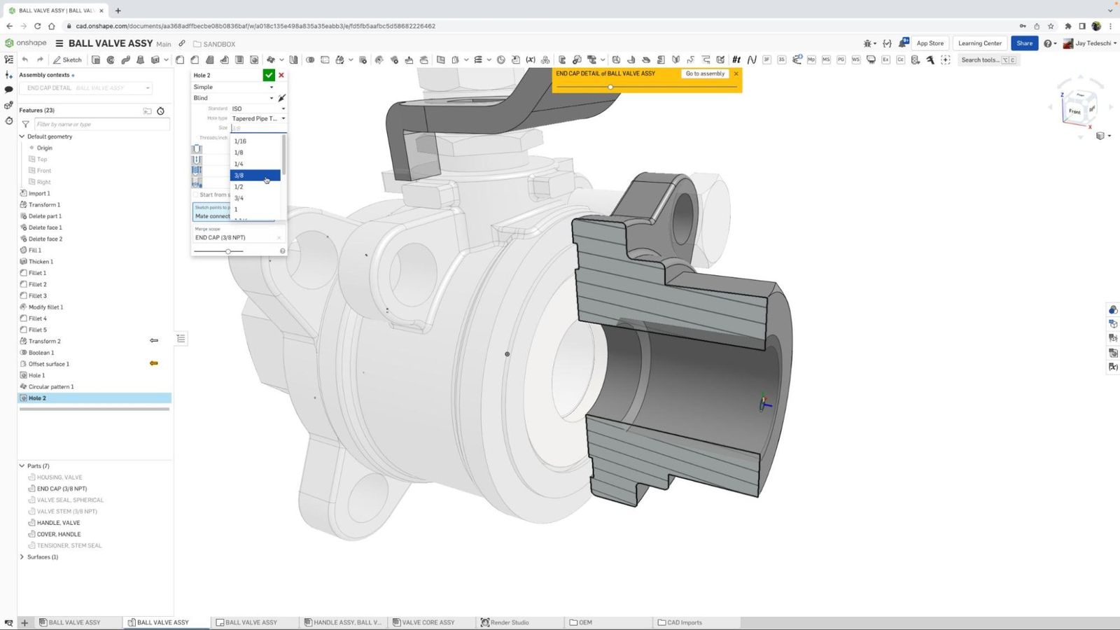 Tapered Pipe Holes and Call Outs: For design work on components specific to those systems used to transport liquids, gases, steam, and/or hydraulic fluid, pipe threads are required for compliance with various industry standards, e.g., ASME. Onshape’s new Tapered Pipe Threads tool ensures that your parts and drawings are compliant with those standards.