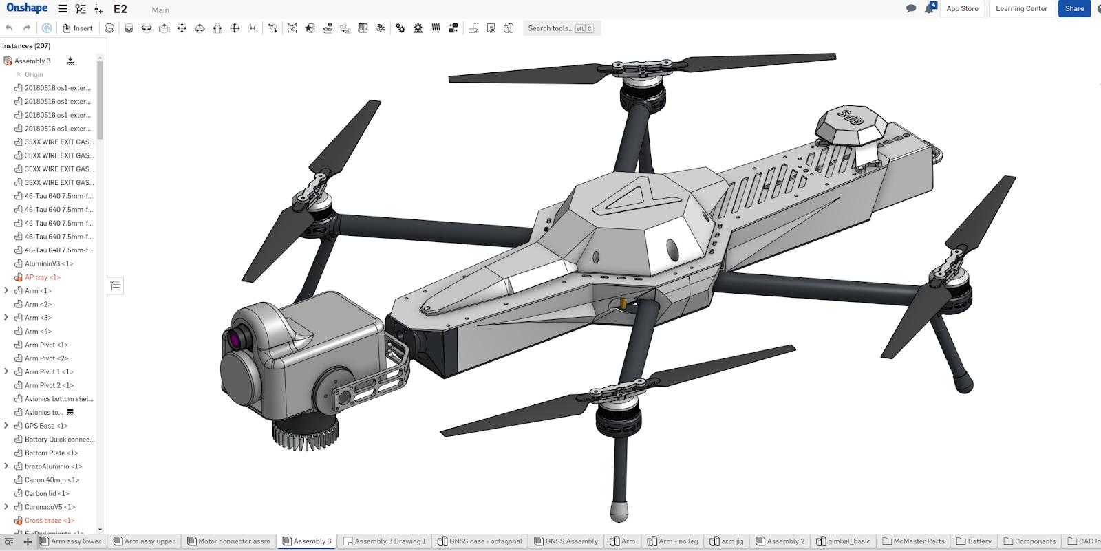 The Black Swift E2, designed in Onshape, is an advanced unmanned aerial system (UAS) quadcopter for automated industrial and structural inspections. (Screenshot courtesy of BST)