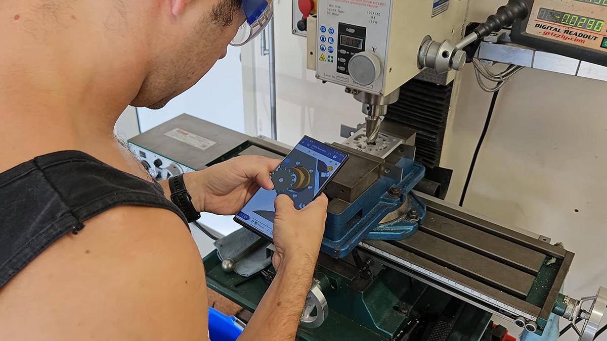 RoboGym team member Matt Birkel double-checks the geometry of a machined part in Onshape from the Onshape Mobile app.