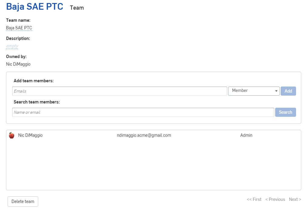 To create a team, click on your name at the top right when you are signed into Onshape. Then select “My Account” and click on “Teams” from the list on the left. Create at least one team for your whole organization. Then add members to the team. You may also want to create separate teams for each subsystem so you can give permissions per group.