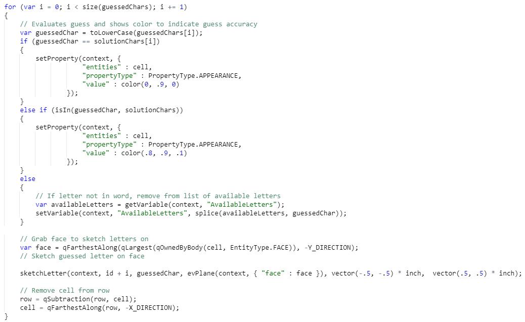 This was done using a series of global variables and setting up the guess inputs as configuration parameters. Each configuration parameter corresponds with an individual Onshape Wordle custom feature, which checks the guess and updates the board with the results.