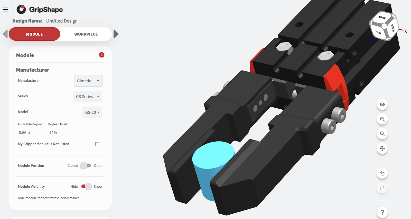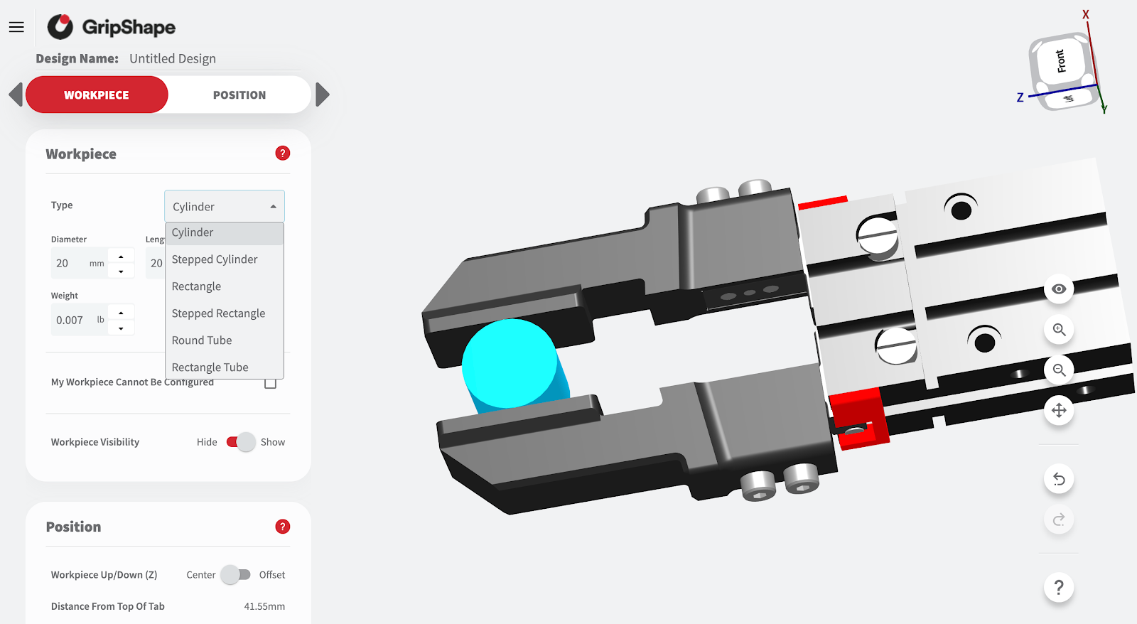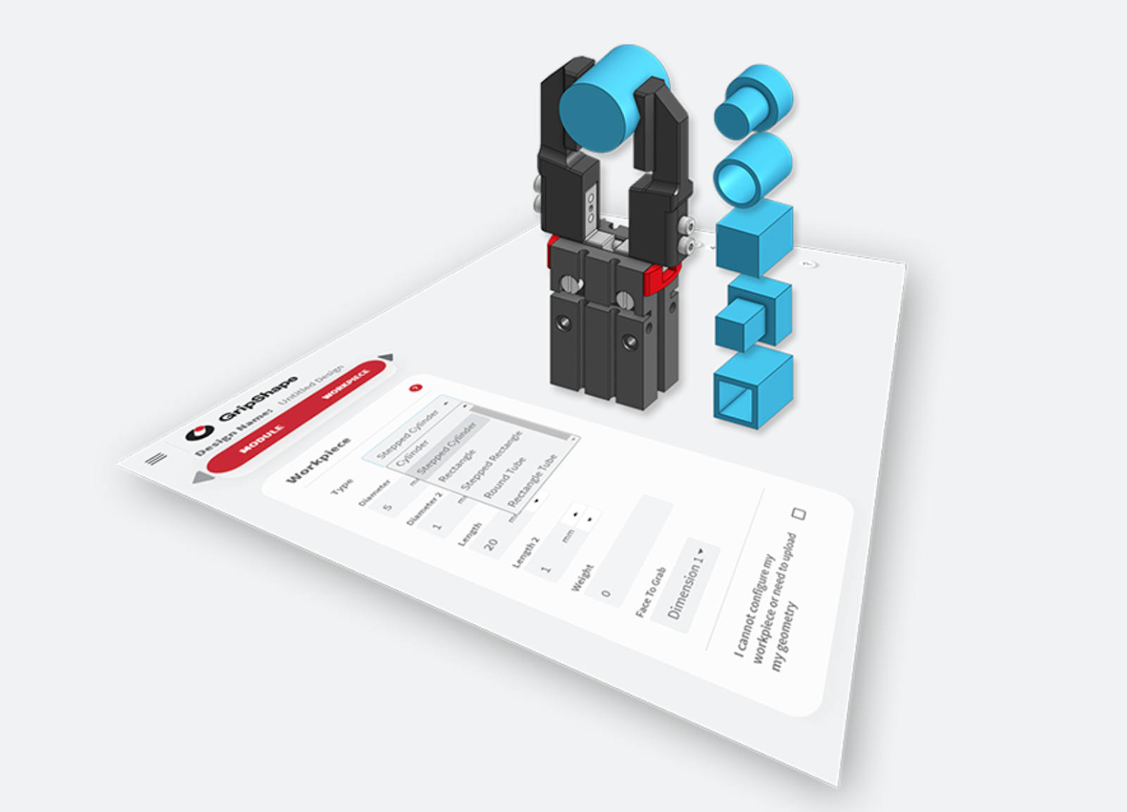 With GripShape, customers start by selecting a gripper module from a list of manufacturers. Then they choose a representative workpiece and adjust its size.