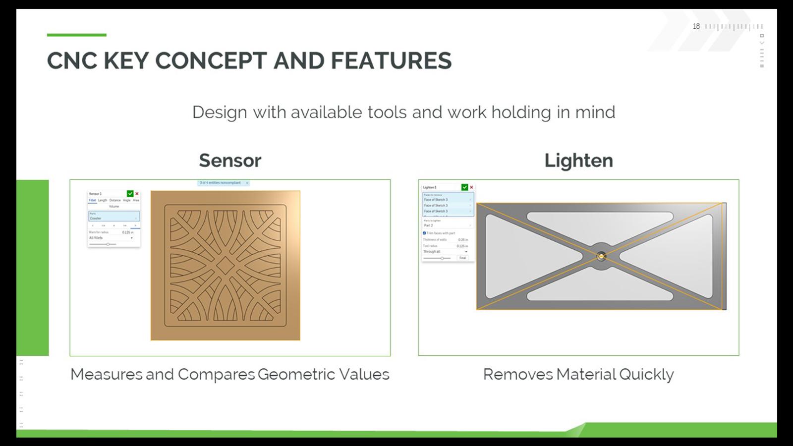 - Lighten: Removes material quickly from parts and can account for tool radius.