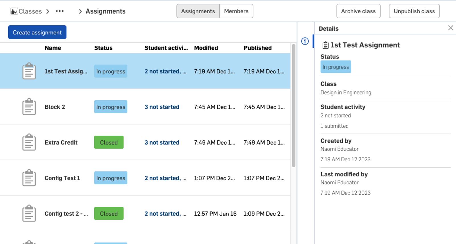 This functionality allows educators to create classes, add members such as students or TAs, and assign work using a simplified interface. Educators can create as many assignments as needed throughout the school term. Once the term is over, classes can be unpublished and cloned to become templates for the next term – a great time saver as you refine your curriculum and coursework over the years.