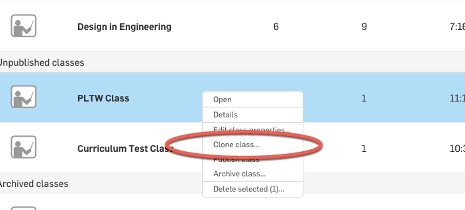 At the end of a term, you can clone an active, unpublished, or archived class. This will create a new class containing drafts of all the assignments from the original class but without any members. This is a great way to reuse the hard work you have already done.