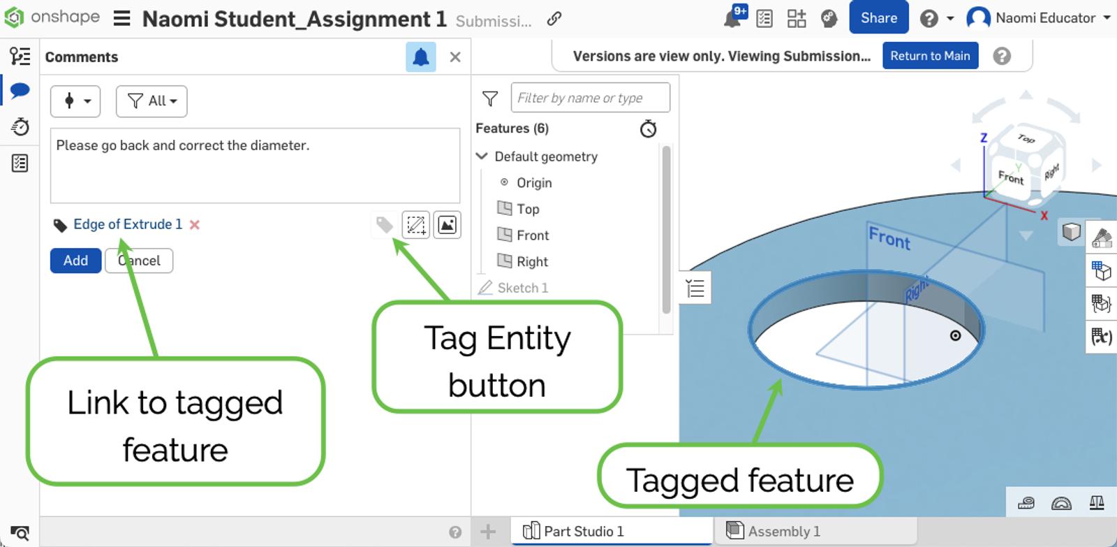Leave Comments on your students’ submissions to help them improve their work. Use the Tag Entity feature to create links so students can easily view the specific part of the document the comment refers to. Students will be notified of comments left on their documents.