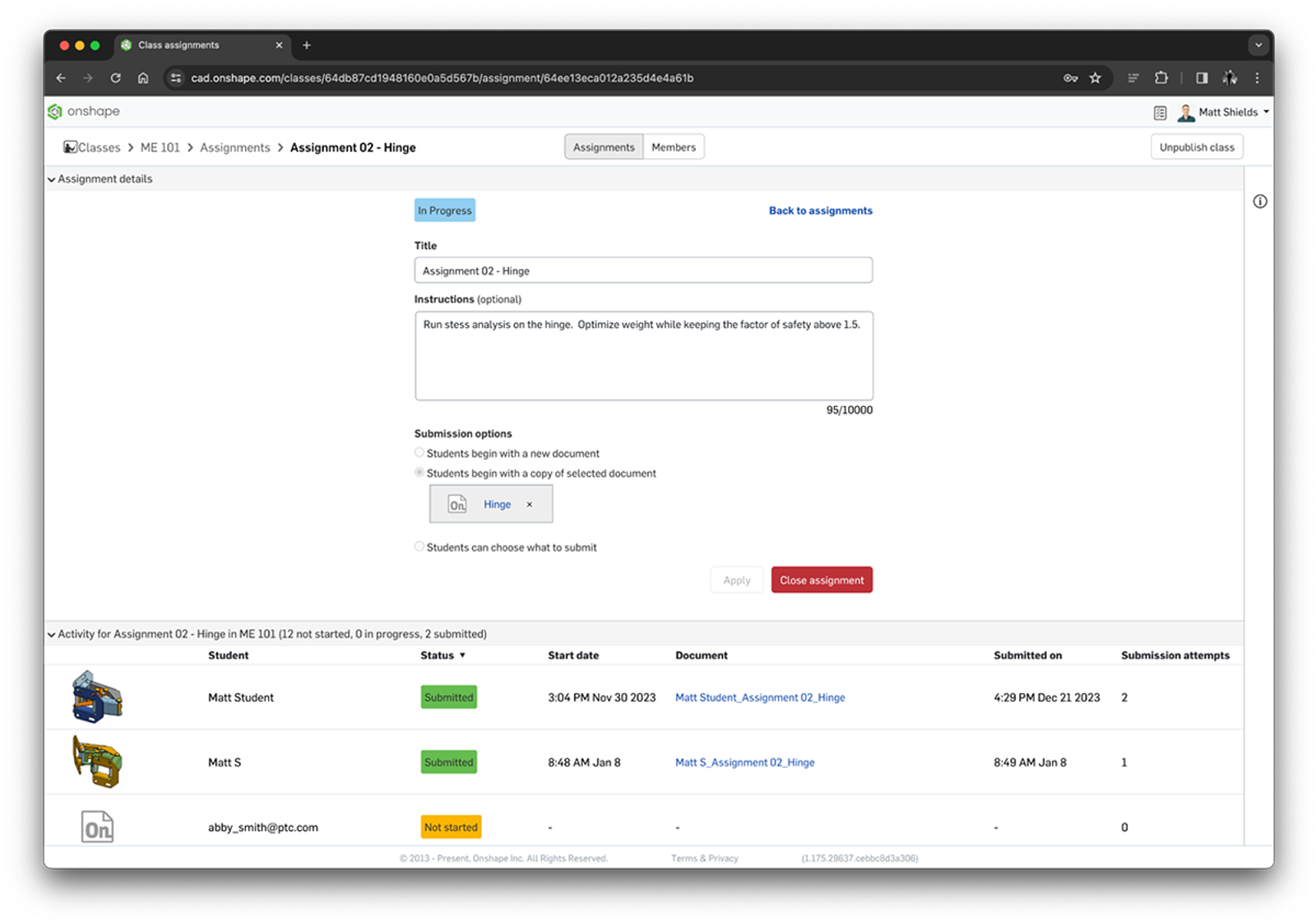 In Onshape, I could easily monitor who had started which assignments and exactly when they were submitted. One click would take me right to their models, where I could leave comments and provide opportunities for resubmission. Classes & Assignments is intended to supplement and not replace your LMS, but it places so much of the assignment distribution and organization under one roof. The time savings are remarkable.