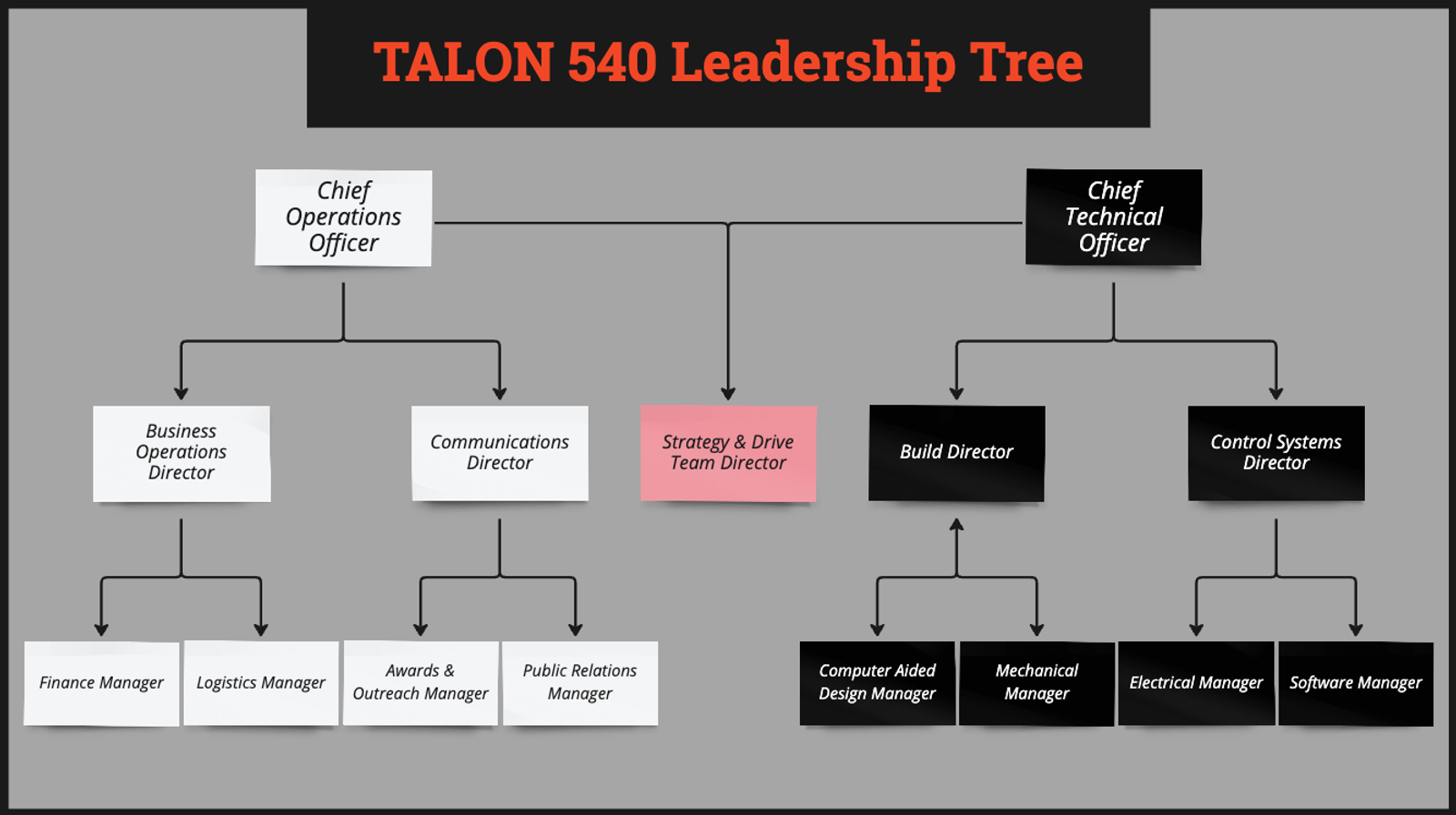 TALON 540 applied a corporate structure to their team to facilitate better communication, efficient and informed decision-making, and increase the contributions of each team member. Similar to corporate structures, they split the team in two. The Technical Officer in charge of all things robot-related leads the Tech Team, and the Operations Officer in charge of business operations, events, communications, and advocacy/outreach leads the Operations Team.