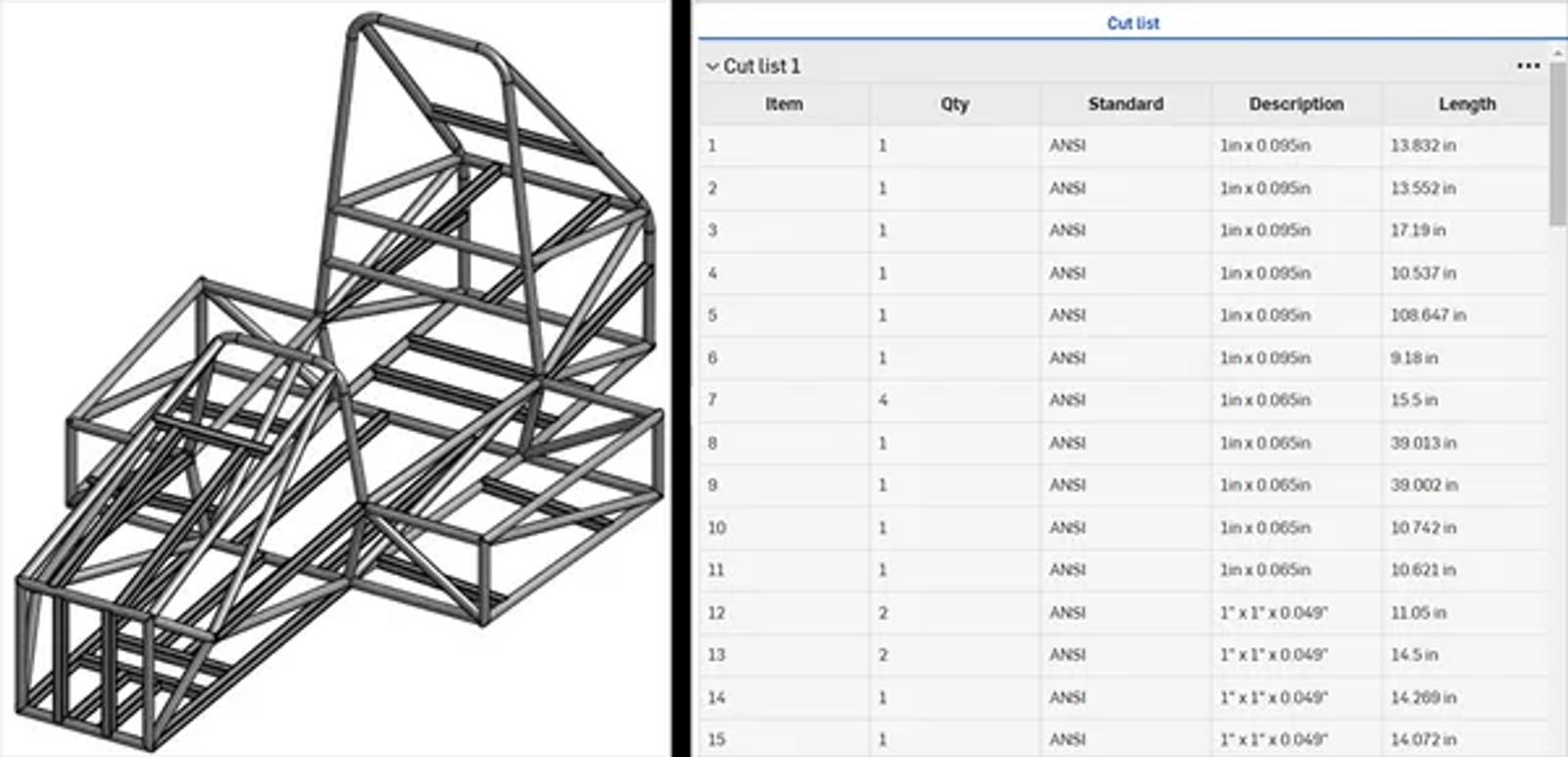 One of the most exciting features is the Frame tool. This feature allowed me to recreate the chassis in Onshape after making a 3D sketch of the frame. I select the frame type and connection points, then let it generate. Onshape’s “cut list” is also handy to show a Bill of Materials (BOM) of all the frame components and cut sizes/angles.
