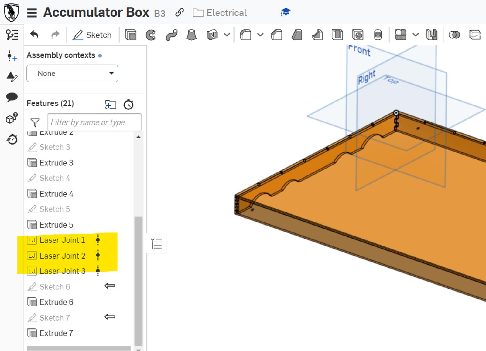 In redesigning the high-voltage containers, shown below, Onshape’s versioning, branching and merging proved very useful for our collaboration. Multiple members could work on the part or assembly without worrying about editing someone else’s design. After making their respective part modifications, it was easy to see who made which edits and select the desired design. We could choose the desired features from different branches to incorporate into the part, then merge them into a main Part Studio.