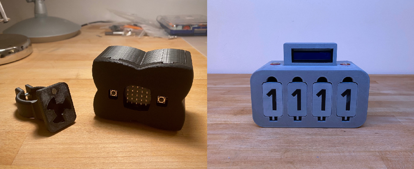 eLight, left, a smart bike rear light, and the LearnAry, right, a screenless toy for kids to teach binary numbers.