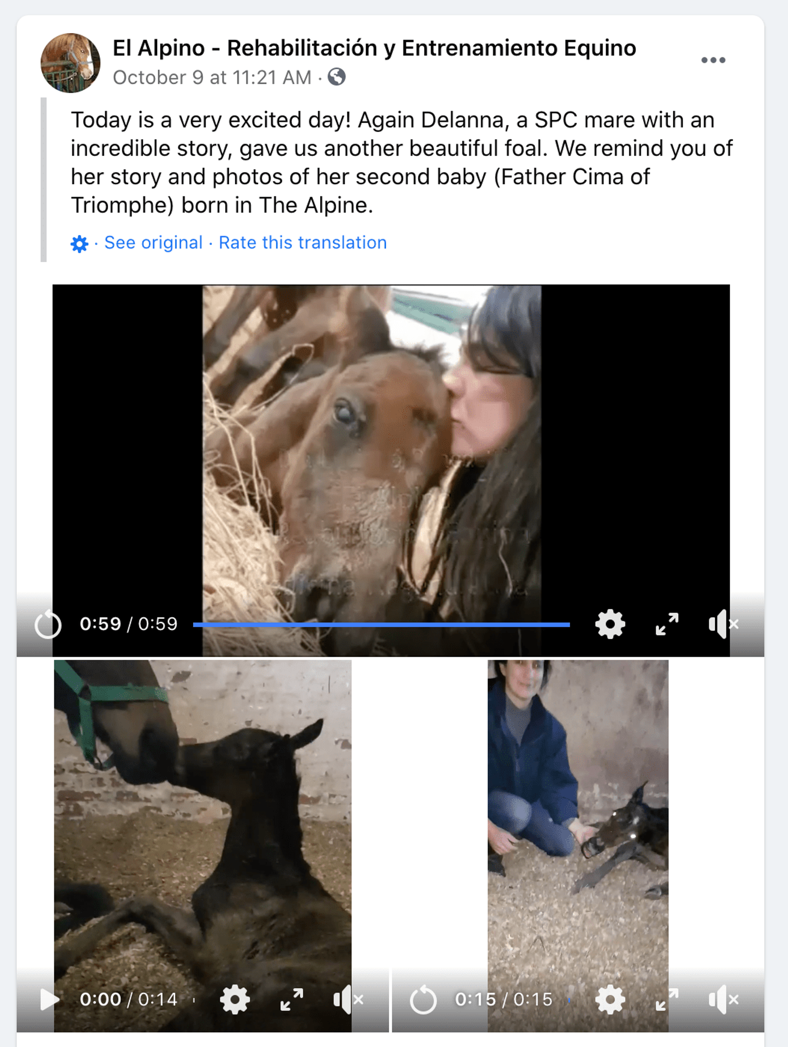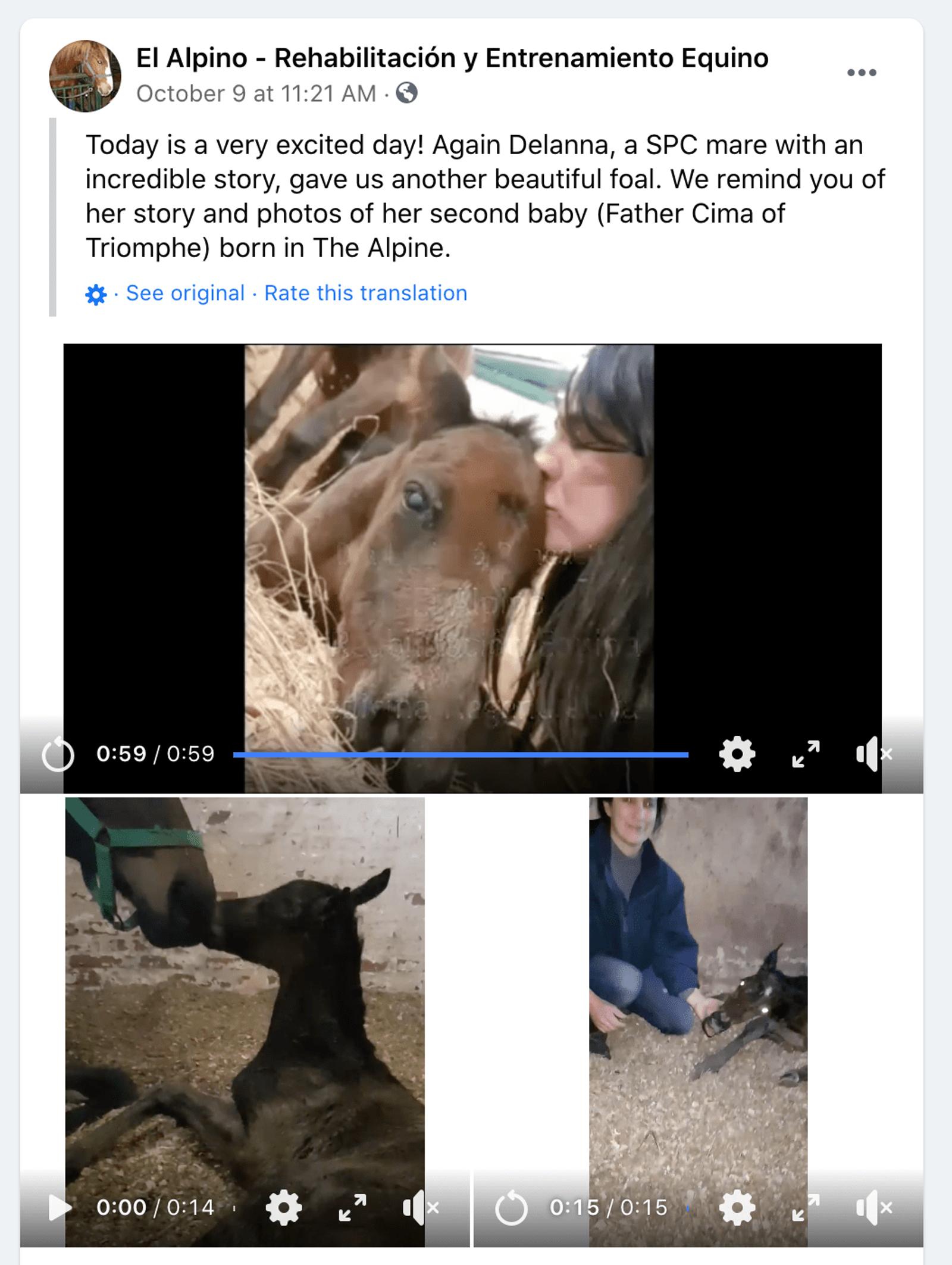 Back in Argentina, life is looking much more promising for Delanna, too. According to the El Alpino Horse Rehabilitation Center, she just gave birth to her second foal.