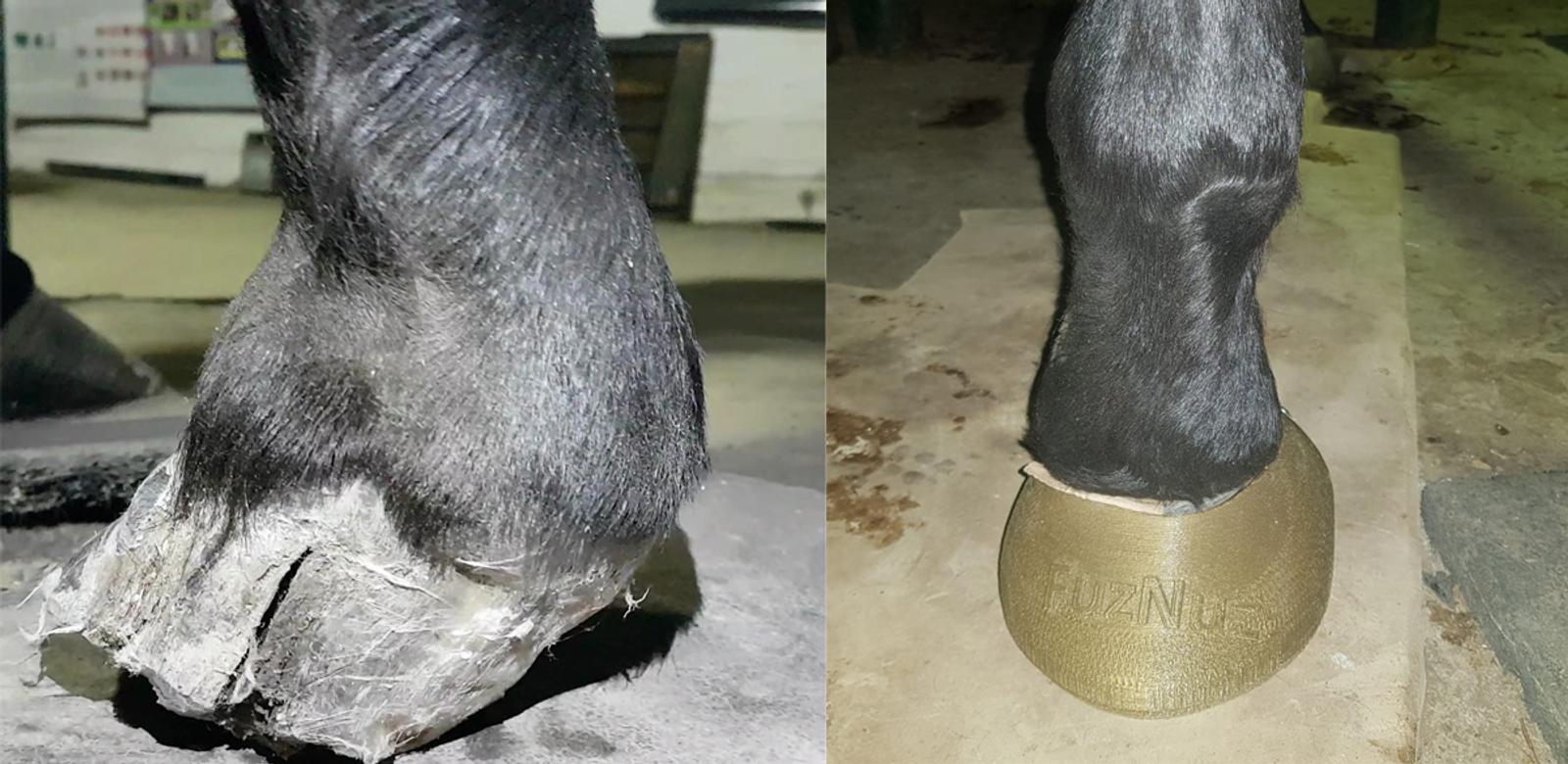 >Before and After: Pictured on the left is Delanna’s misshapen hoof growing backwards. On the right is the same injured hoof fitted with a 3D-printed prosthetic.