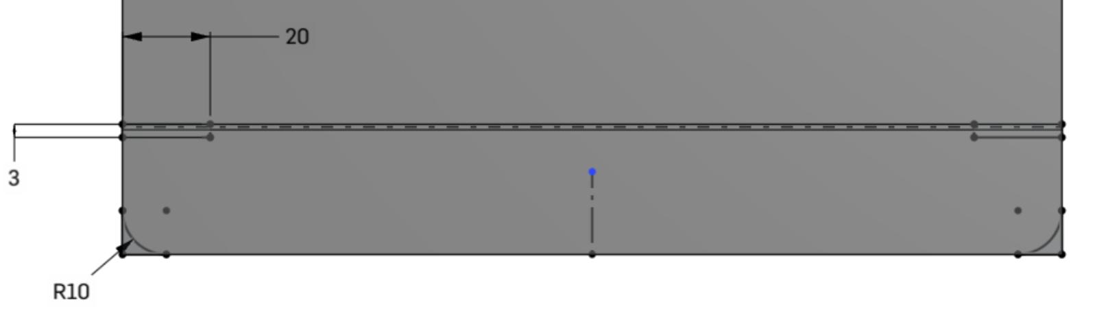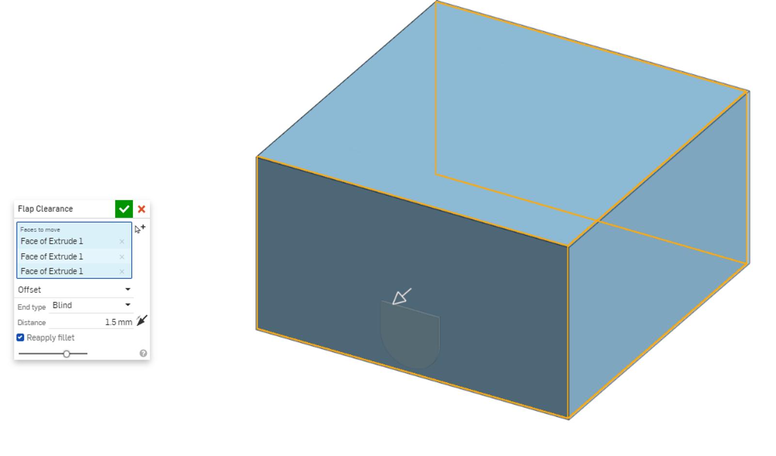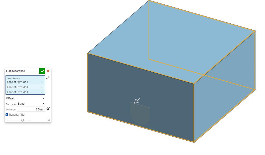 Before we add the edge flange, we need to clear some space internally. The front locking flap will interfere with any more material we add, so first we need to shift this over by our handy variable of sheet metal thickness + 0.25mm.