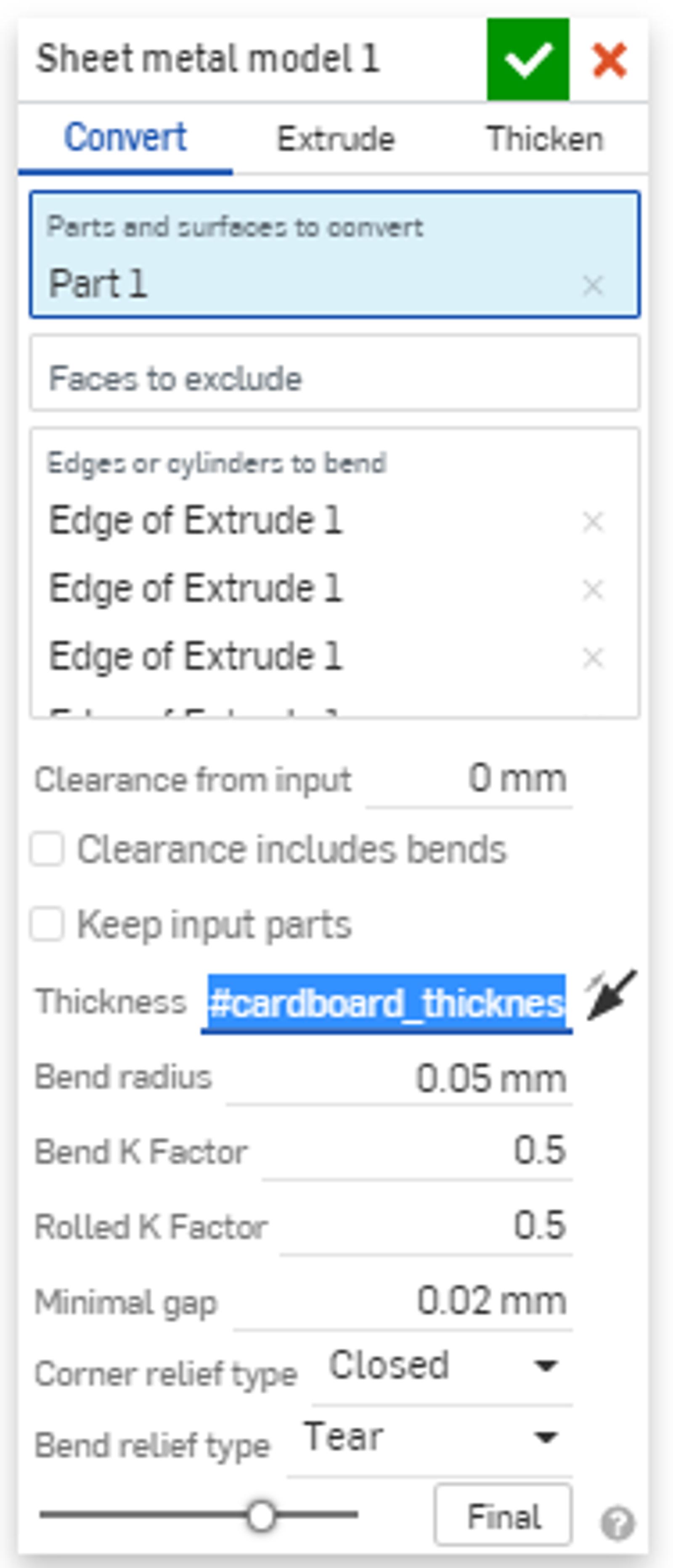 - Using the Sheet Metal tool, convert the bounding box. Set the inner radius to a very small value like 0.05 mm, as cardboard folds onto itself and doesn’t stretch like sheet metal. The K value can stay at the default value of 0.5. Make sure to set the thickness to the variable defined above.