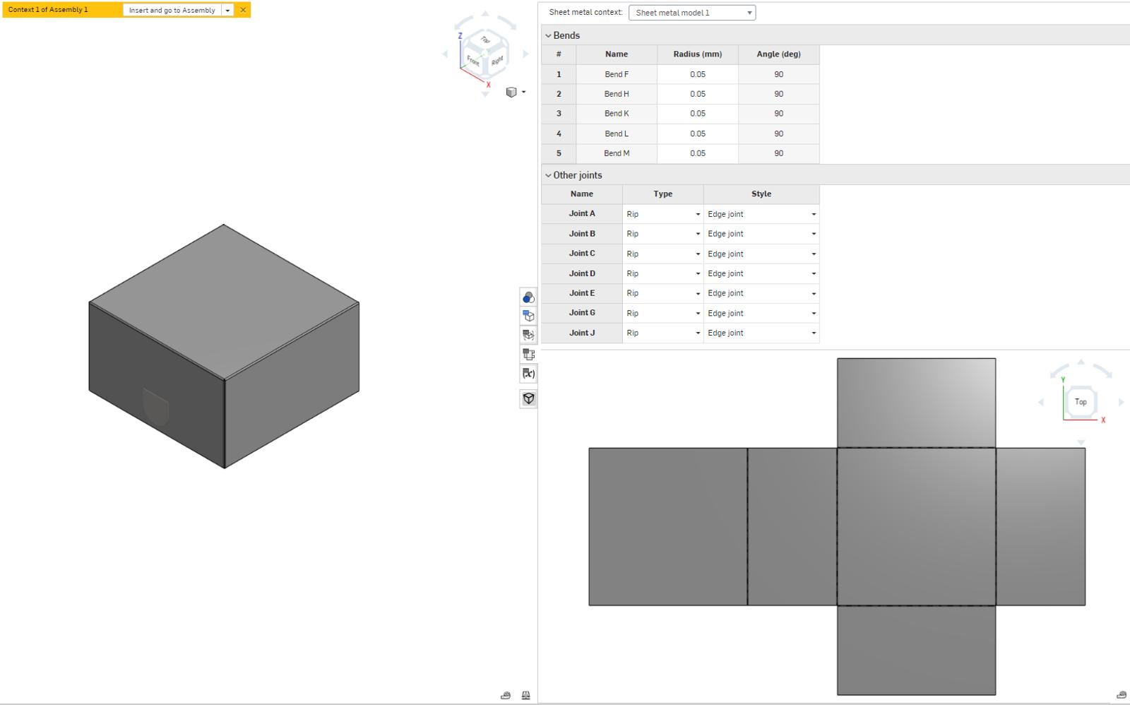 - NOTE: This is where it comes in handy to have a reference dieline selected. The goal is to get your flat pattern to represent the selected dieline. Selecting different edges to include on your sheet metal part will yield different flat patterns, so feel free to experiment until your flattened view looks right.