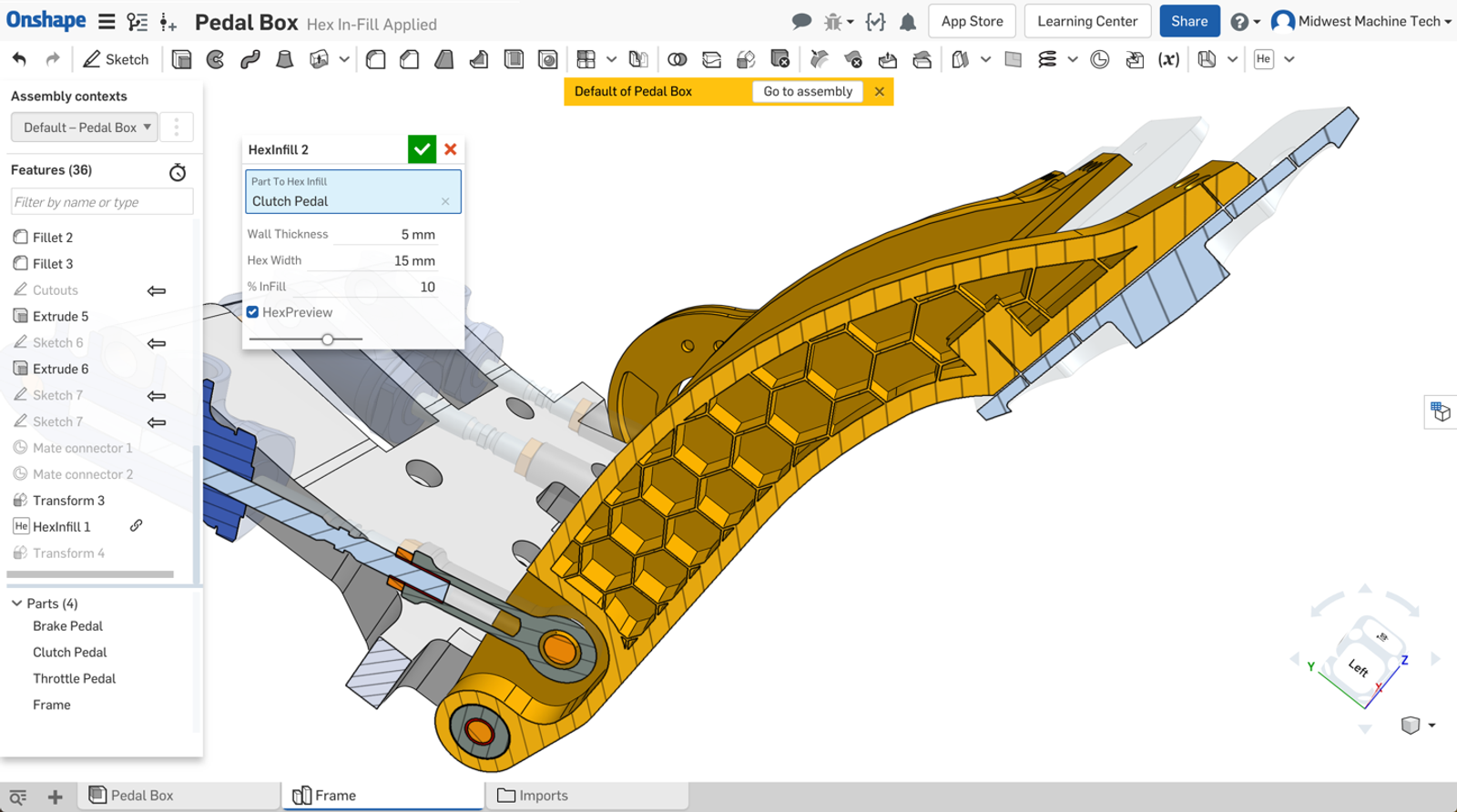 Created with Onshape’s FeatureScript, “Hex Infill” is a customized CAD feature designed to save material and time when 3D printing parts. Although this is a user-written feature, it behaves exactly like Onshape’s own built-in features.