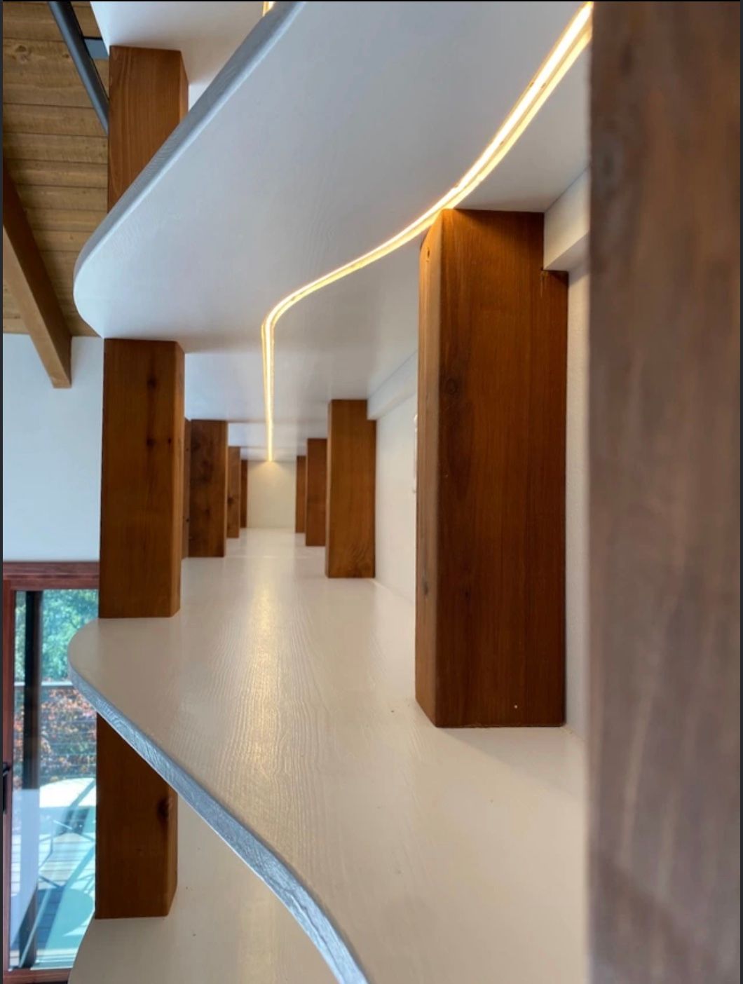 The right side of the shelf curves from 16” deep to 6” deep, so the edge that’s exposed to the open air doesn’t stick out too far, he explained. To guarantee consistent curvature on the shelves, he had a special metal template made by Oshcut, a laser metal-cutting fabricator.